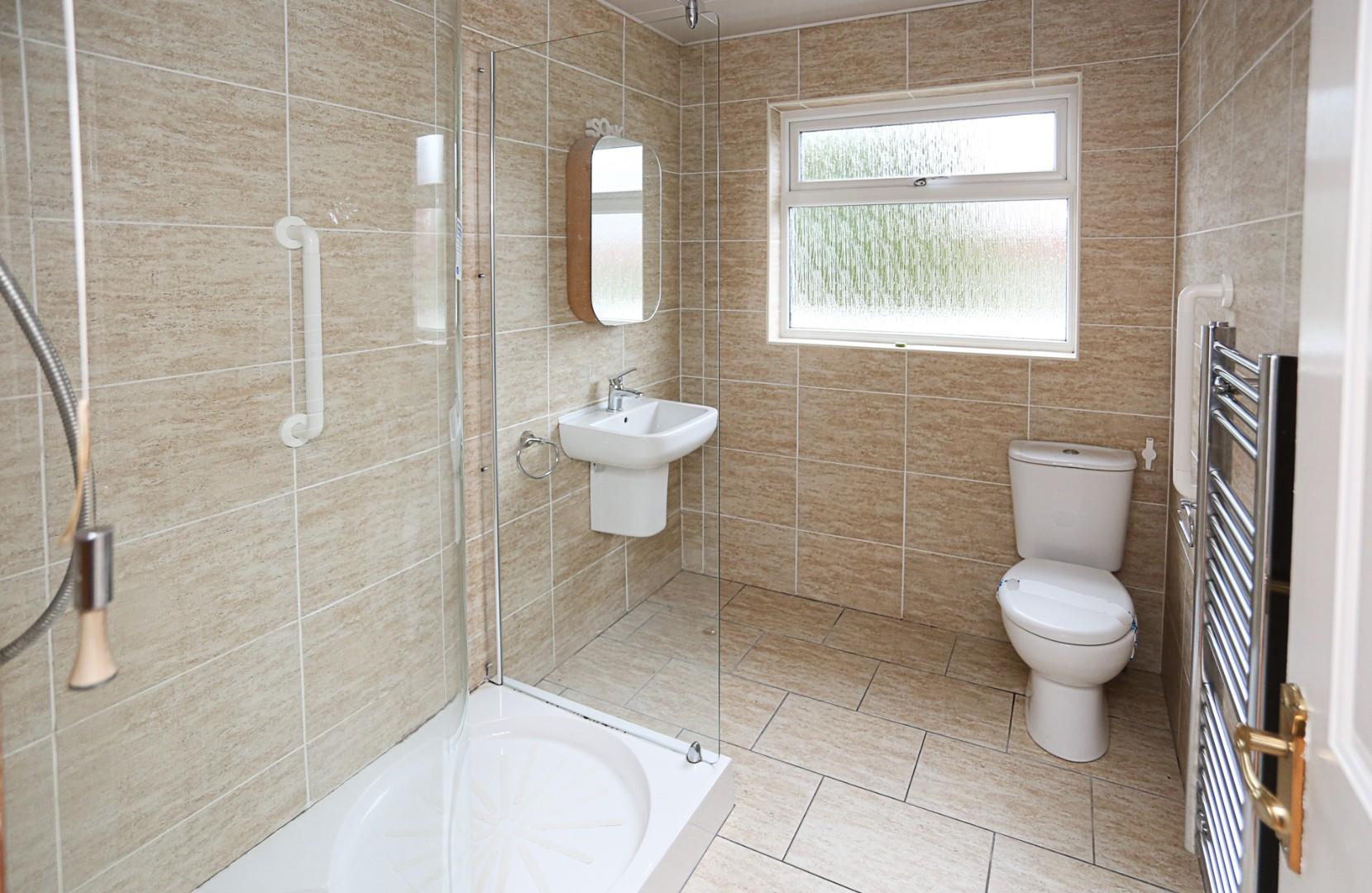 Comprising large shower cubicle, wash hand basin with mixer tap, low flush WC.