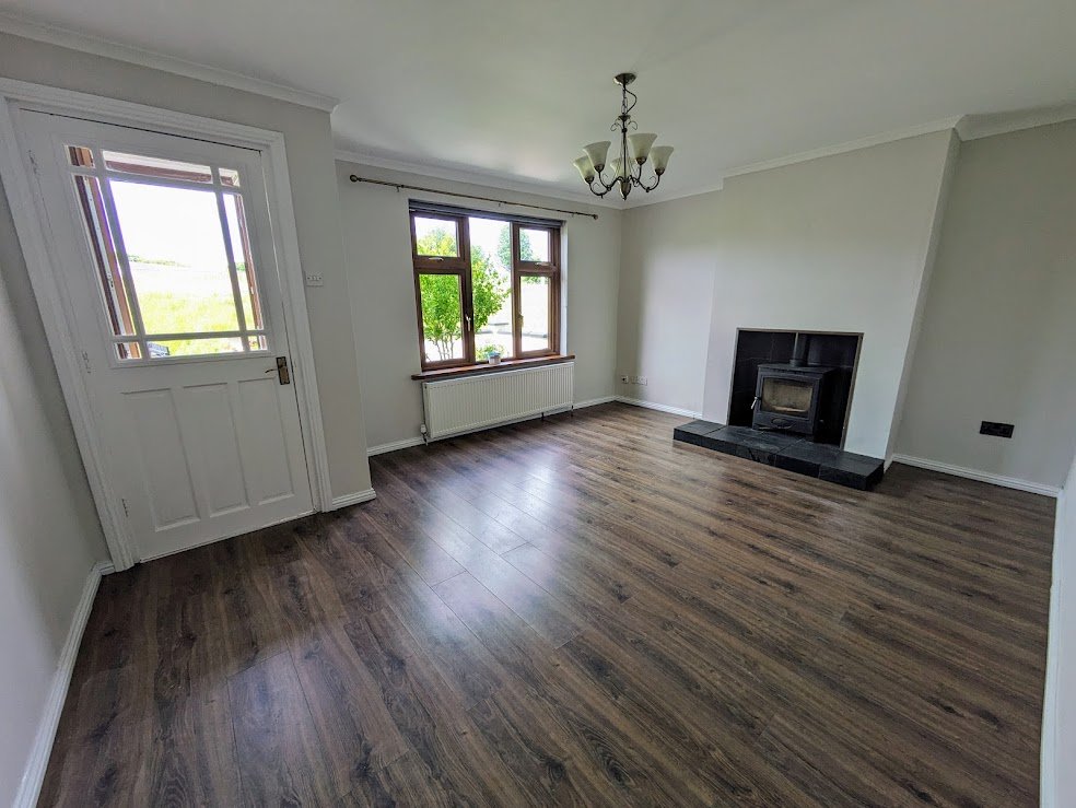 Laminate wooden floor, cornice ceiling, wood burning stove, tiled inset and hearth.