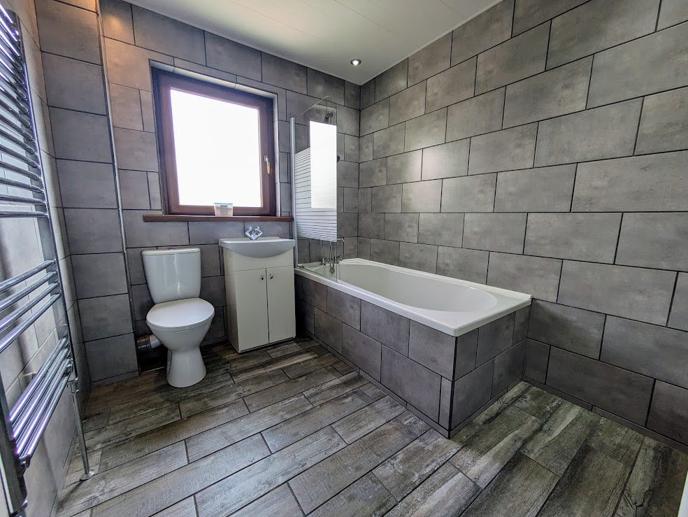 White suite, tiled panel bath with mixer taps, telephone hand shower, dual flush wc, vanity unit wash hand basin, stainless steel heated towel rail, ceramic tiled floor, fully tiled walls, recessed spotlights.