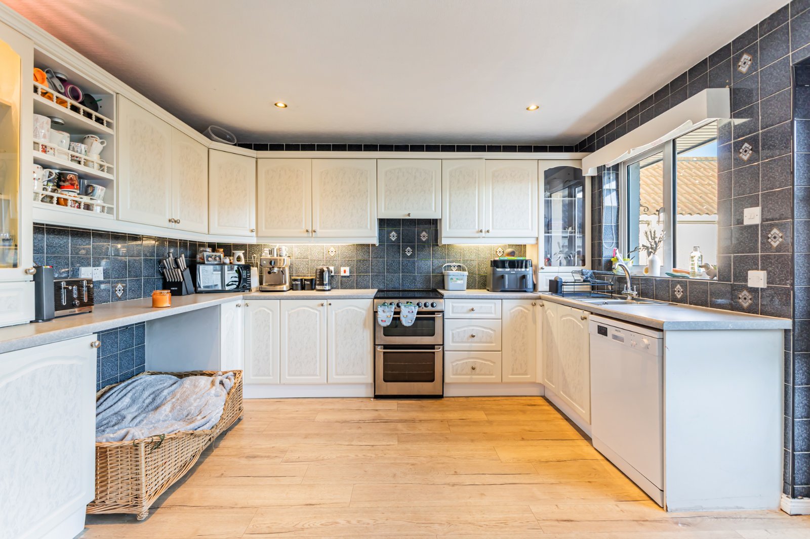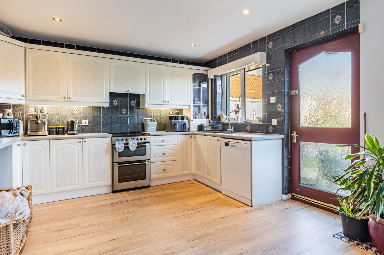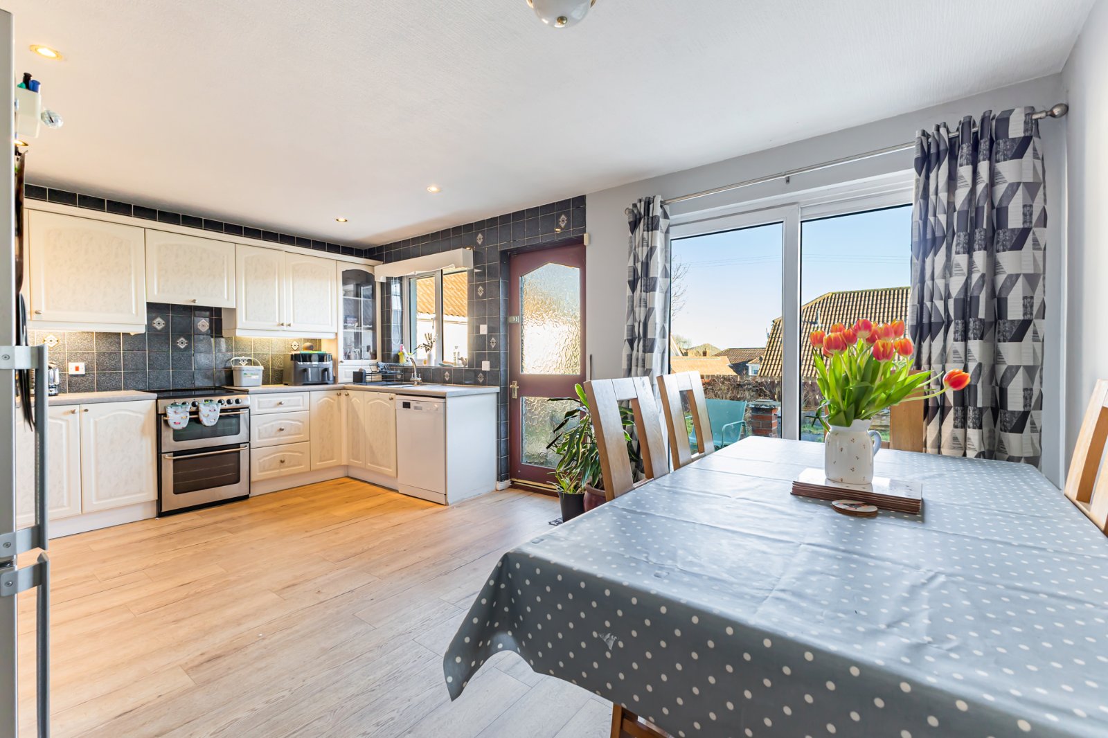 Single drainer 1.4 stainless steel sink unit with mixer taps, excellent range of high and low level units with laminated work surfaces, cooker space, extractor fan and canopy, plumbed for dishwasher, laminate wooden floor, part tiled walls, recessed spotlights, open plan to casual dining area. uPVC double glazed sliding patio door to rear garden.