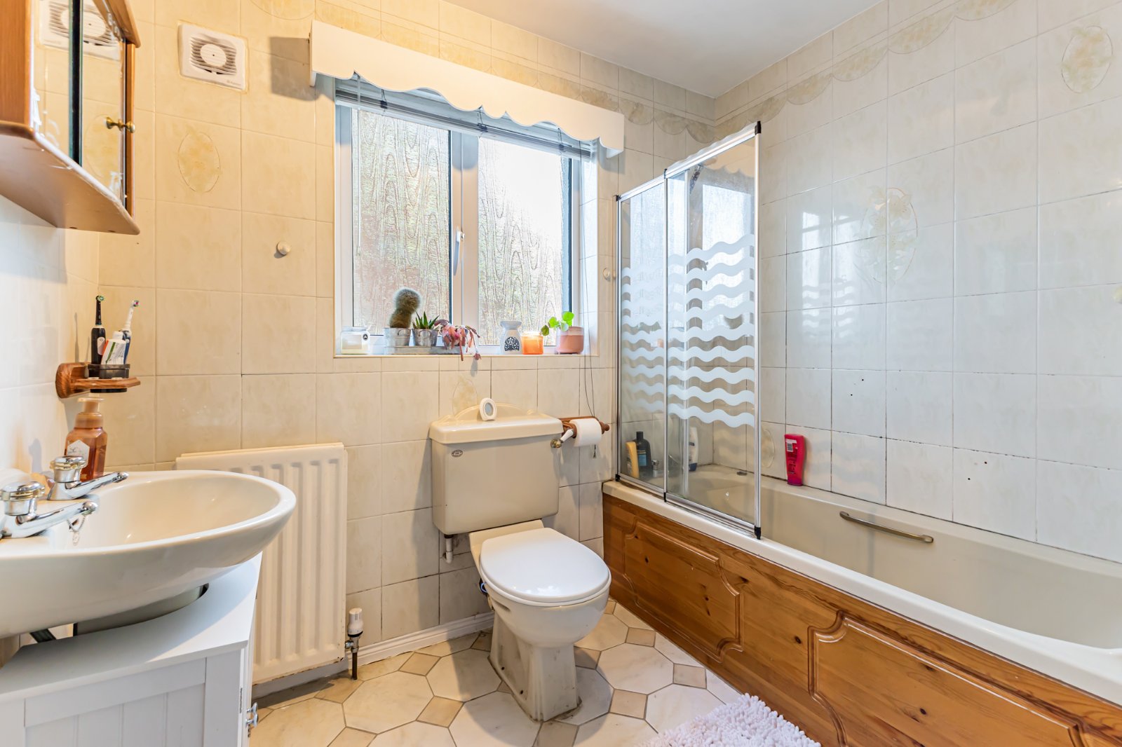Coloured suite comprising : Panelled bath with mixer taps and telephone hand shower, fully tiled built in shower cubicle with electric shower, pedestal wash hand basin, low flush WC, ceramic tiled floor, fully tiled walls, extractor fan.