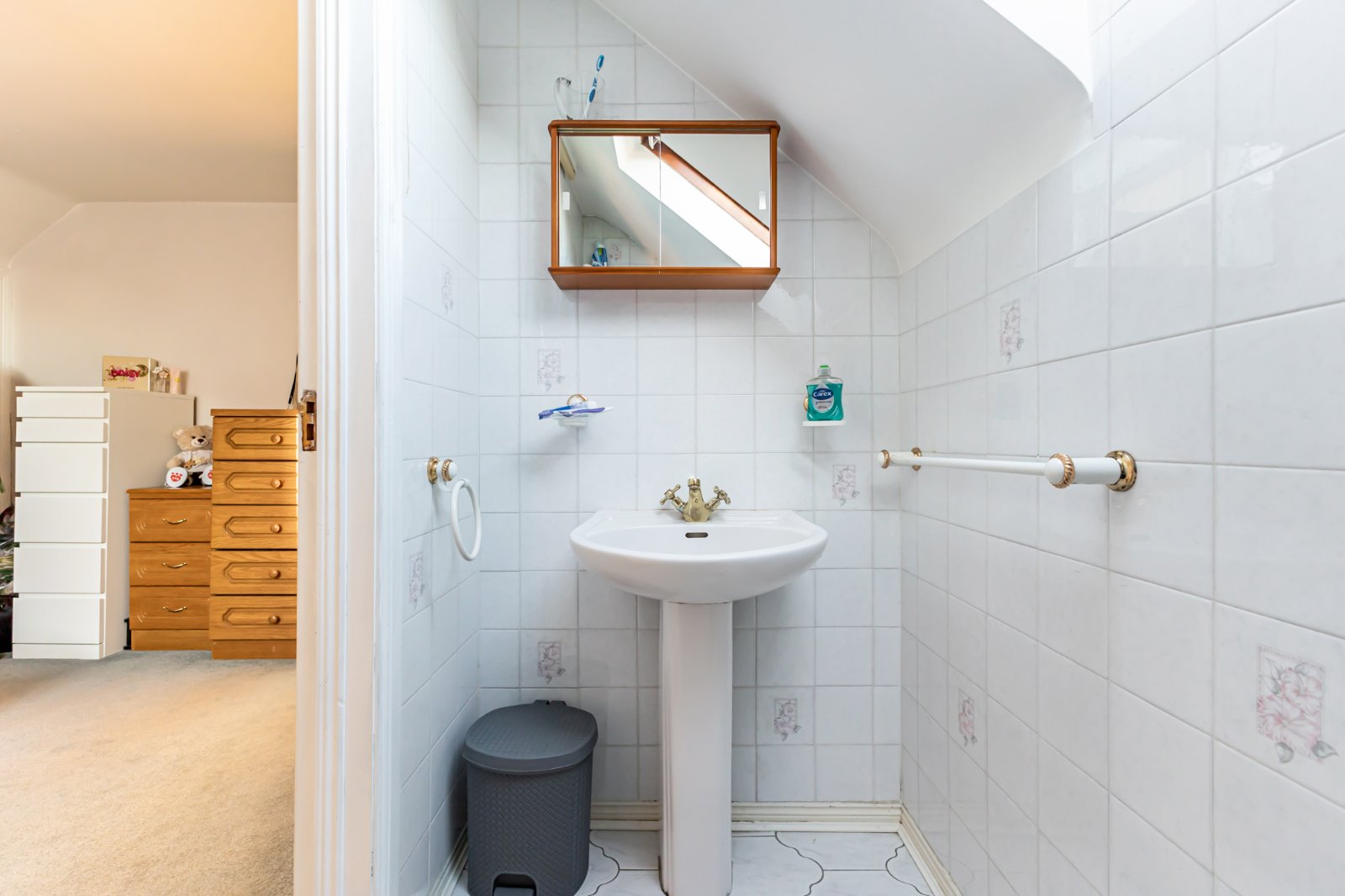 Dual flush WC, pedestal wash hand basin, ceramic tiled floor, fully tiled walls, Velux.