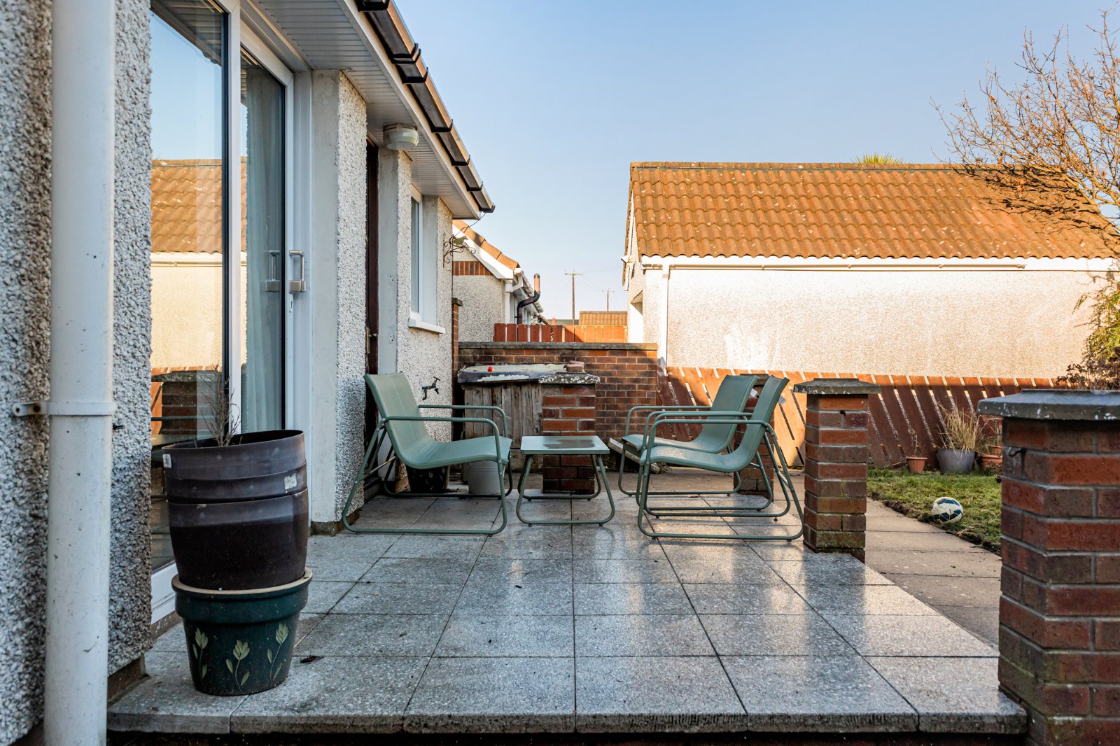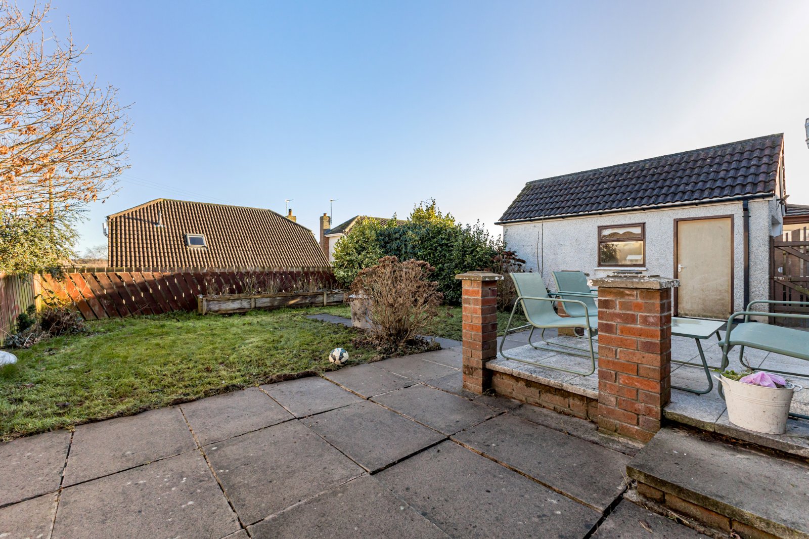 Enclosed rear garden in lawns and paved patio.