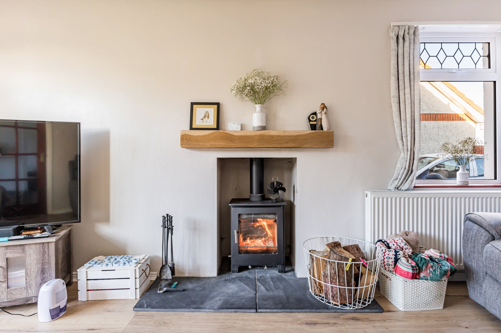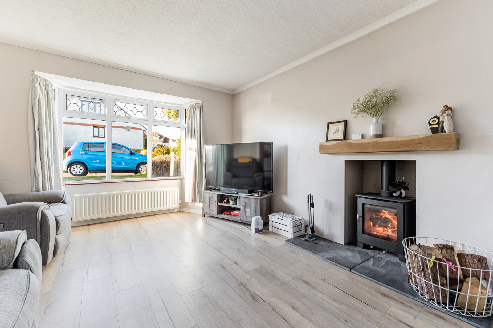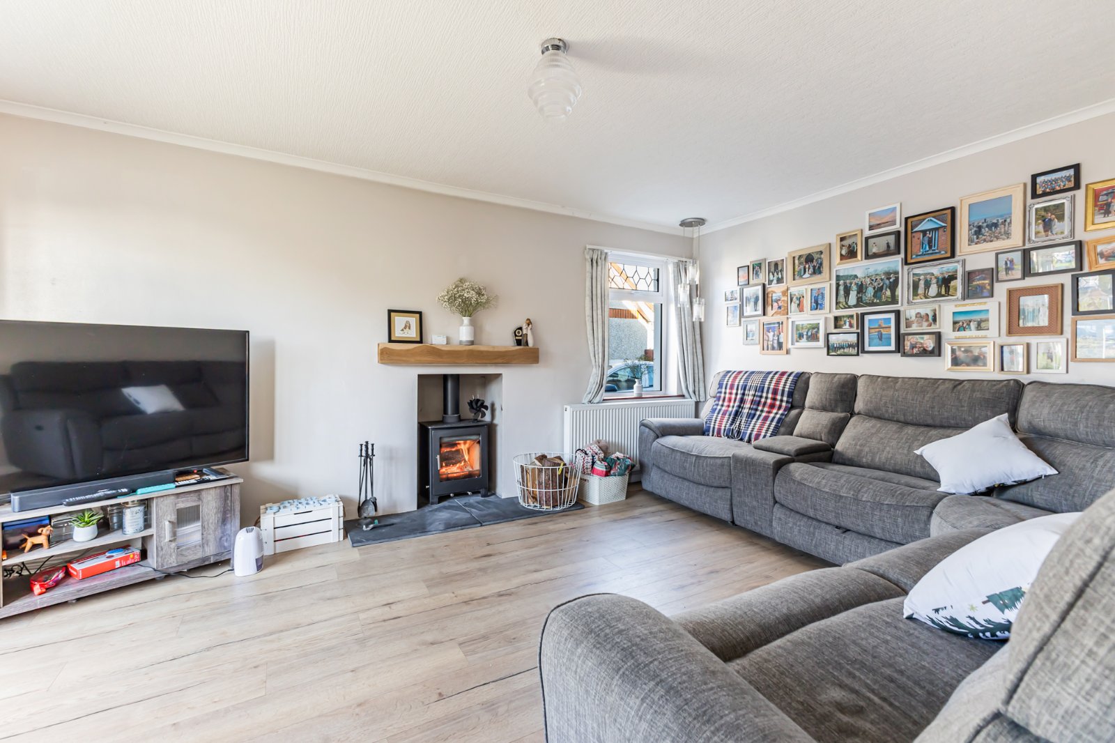 Laminate wooden floor, feature multi fuel stove with slate hearth, cornice ceiling.