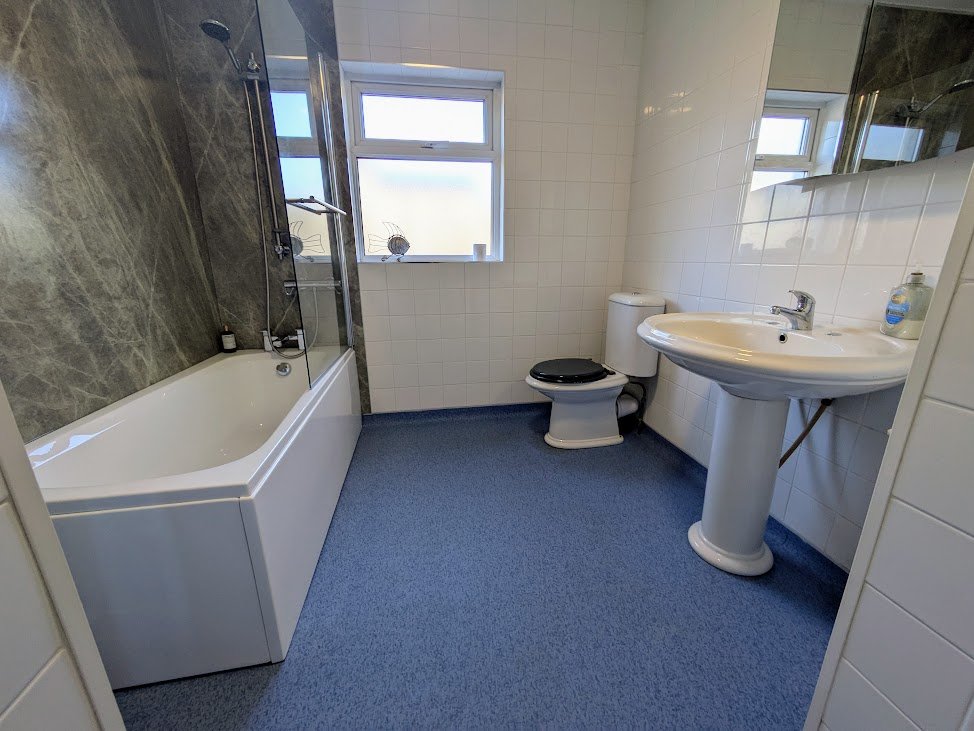 White suite, panel bath with mixer taps, thermostatically controlled shower unit, dual flush wc, pedestal wash hand basin with mixer taps, fully tiled walls, stainless steel heated towel rail, airing cupboard.