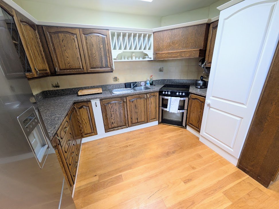 Single drainer stainless steel sink unit with mixer taps, laminate work surfaces, excellent range of high and low level units, built in oven, 4 ring ceramic hob, stainless steel chimney extractor fan, integrated fridge freezer, integrated washing machine, recessed spotlights, laminated wooden floor.