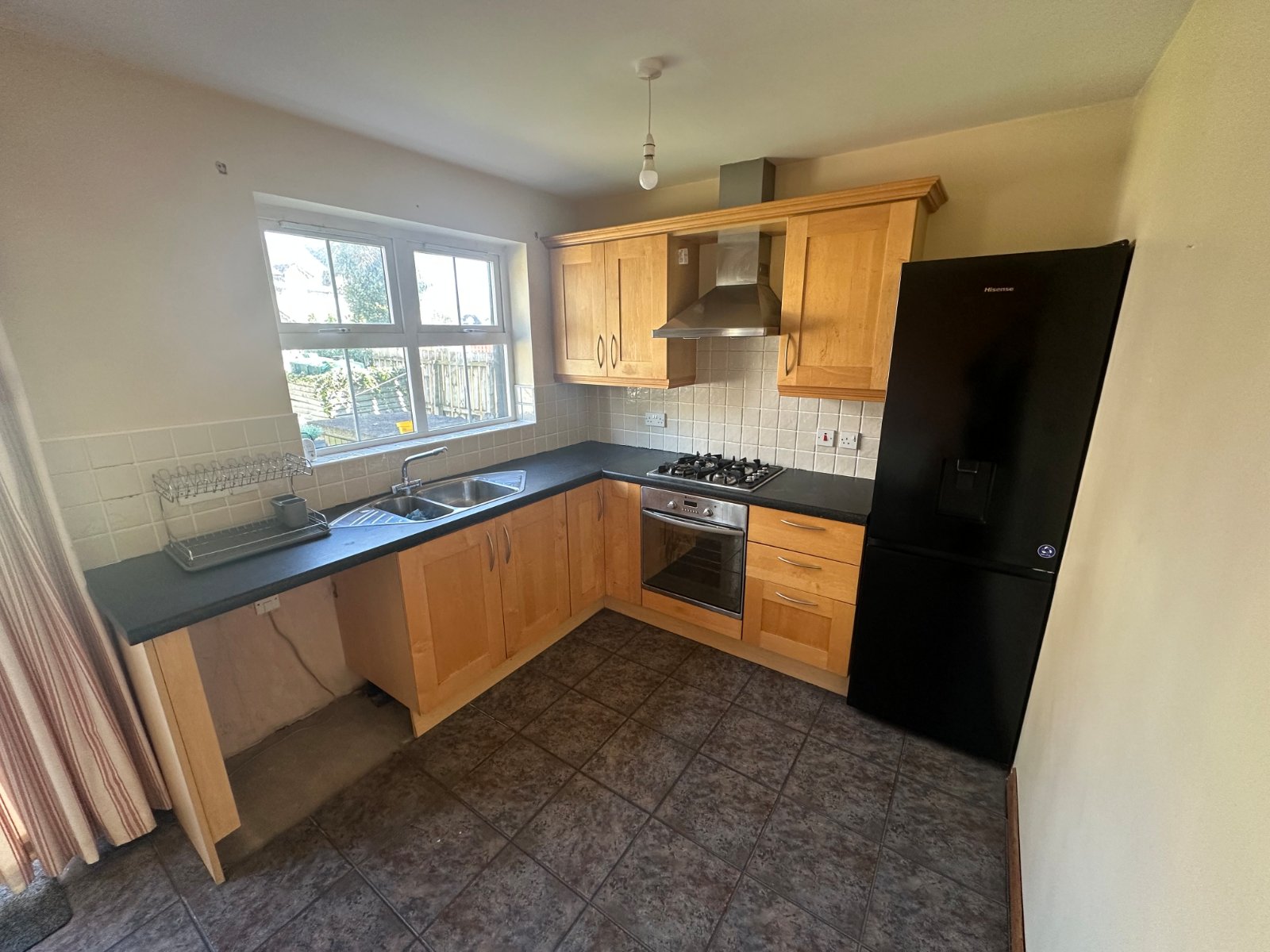 Comprising a mixture of high and low level units with laminate worktops. Stainless steel single draining sink unit with mixer tap. Four ring gas hob with stainless steel extractor fan. Single oven. Tiled floor and part tiled walls. Patio doors to rear.