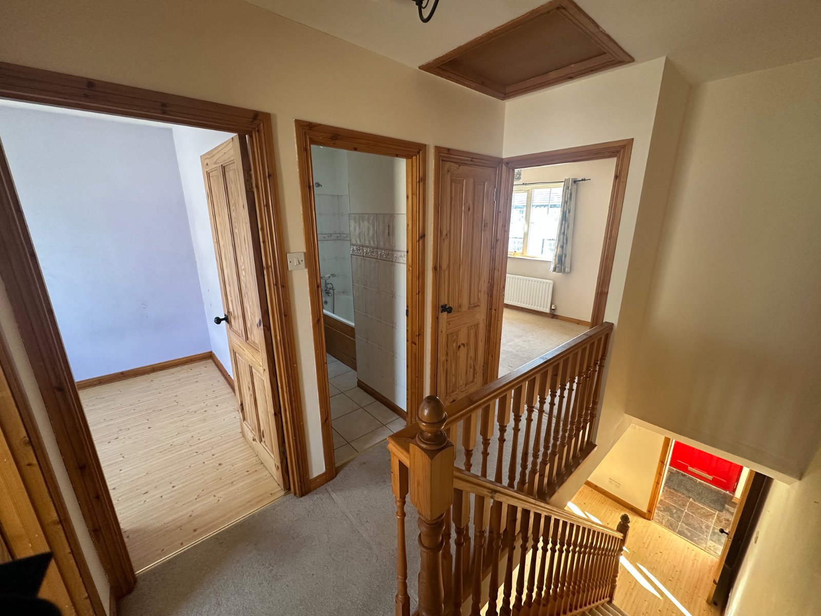 Tiled floor. Hard wood door.
