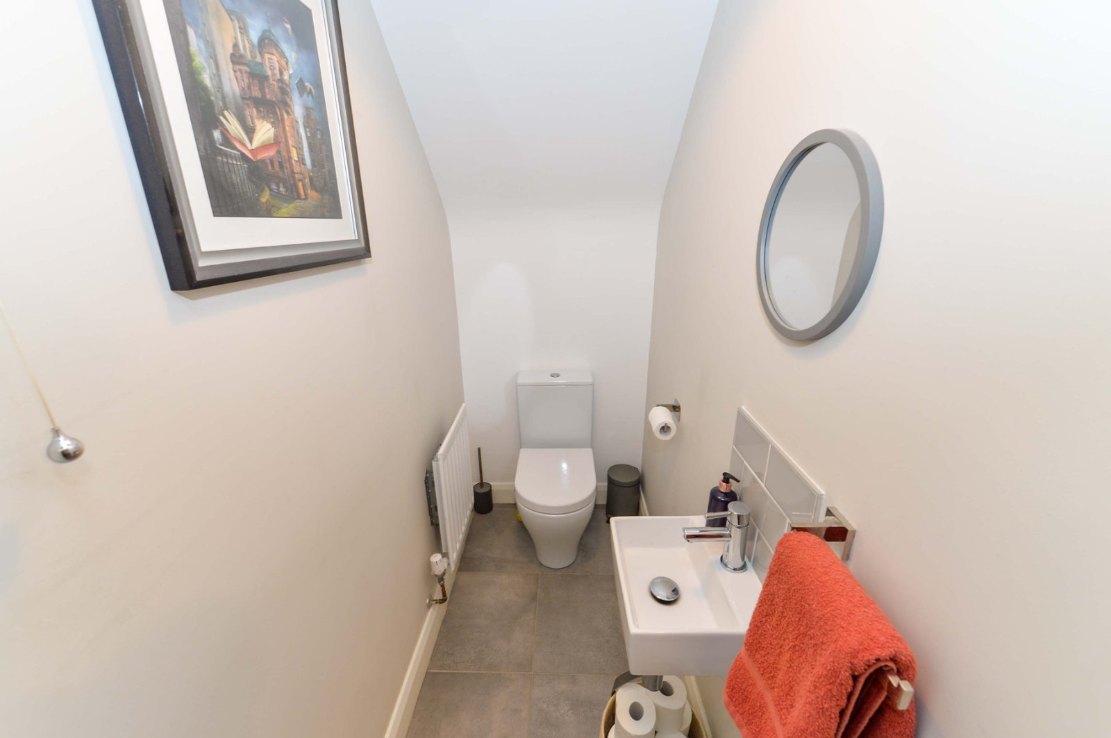 Modern white suite comprising low flush WC and wall mounted wash hand basin with mixer tap. Tiled floor and tiled splash back. Extractor fan.