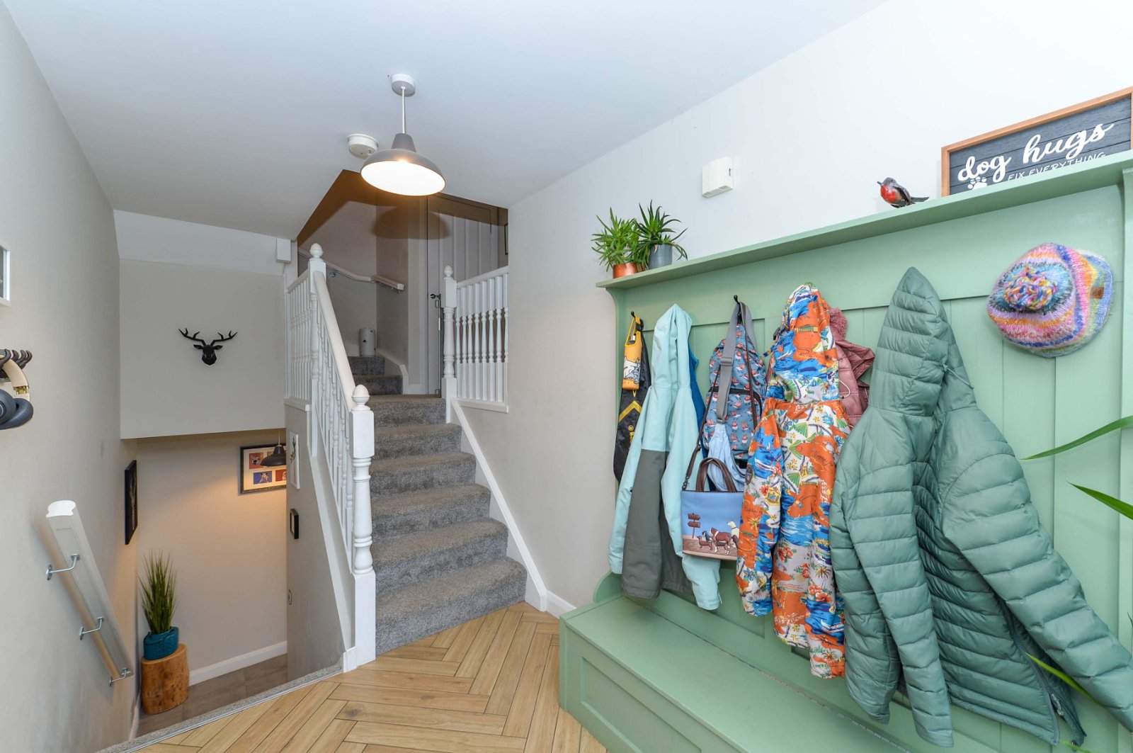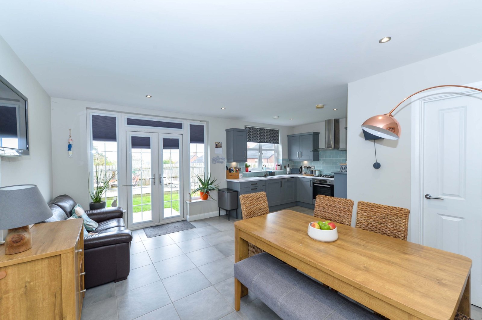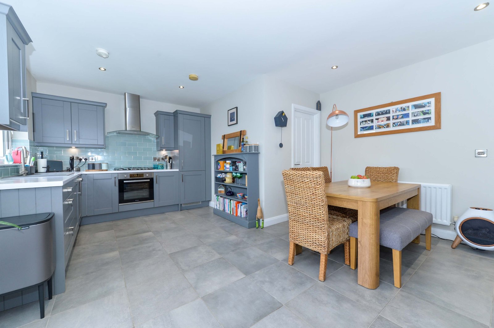 A welcoming entrance hall leads to a bright and spacious living room, tastefully decorated and filled with natural light. The modern fitted kitchen, complete with ample storage and dining space, is ideal for family meals or entertaining guests.