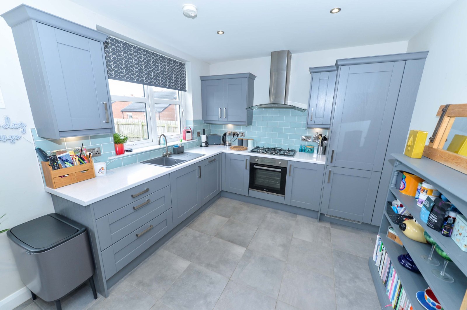 Stunning shaker style kitchen with an excellent range of high and low level units and laminate worktops. Single drainer sink unit with mixer tap. Single oven, five ring gas hob and stainless steel extractor fan. Integrated fridge freezer and dishwasher. Tiled floor and partially tiled walls. Recess spotlights. French doors to rear.