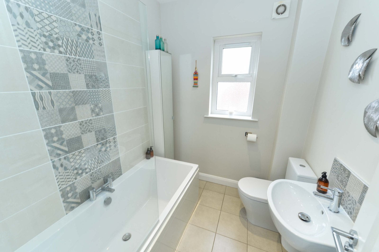 Contemporary white suite comprising low flush WC, wall mounted wash hand basin with mixer tap and panelled bath with mixer tap and thermostatically controlled shower over. Tiled floor and partially tiled walls. Recess spotlights. Extractor fan. Chrome towel rail.