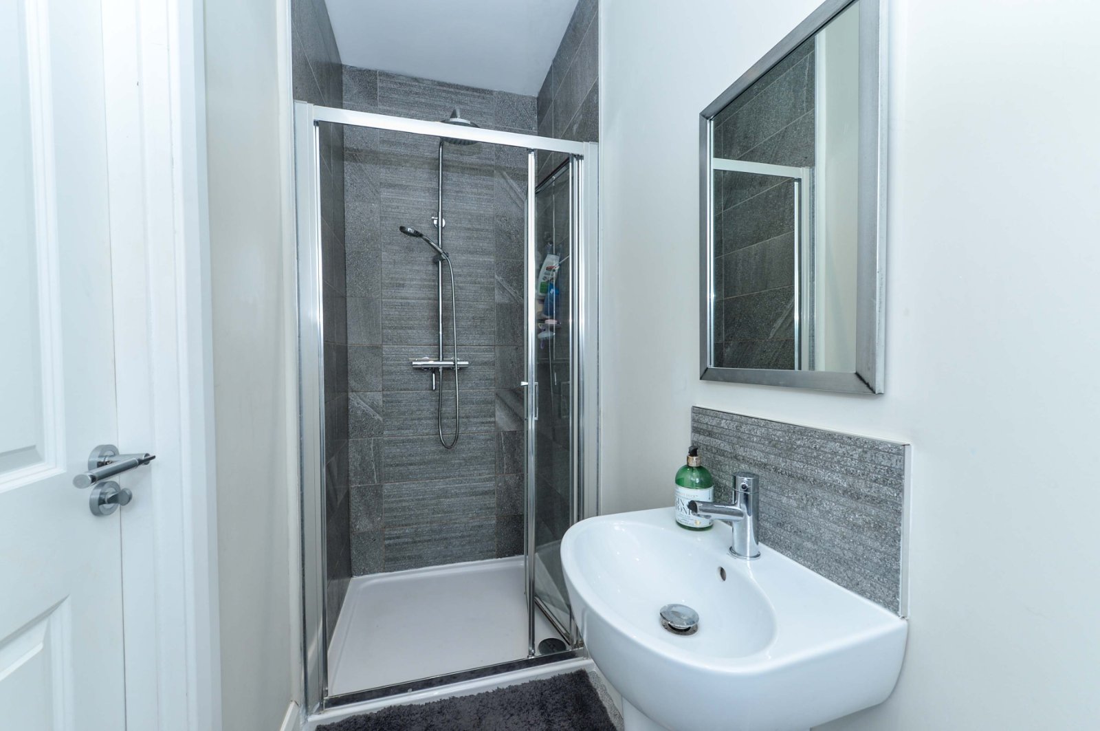 Luxury white suite comprising low flush WC, wall mounted wash hand basin with mixer tap, enclosed shower cubicle with thermostatically controlled shower. Tiled floor and partially tiled walls. Recess spotlights. Extractor fan.