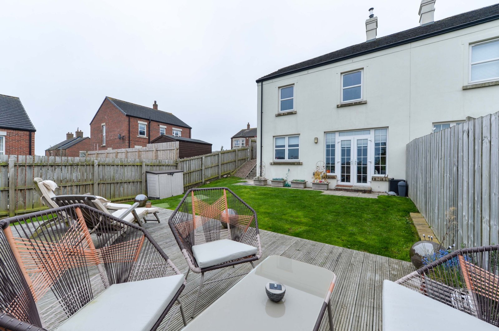 To the rear, a private enclosed garden features a decked entertaining area, providing the perfect setting for barbecues, outdoor dining, or simply relaxing in the evening sun.