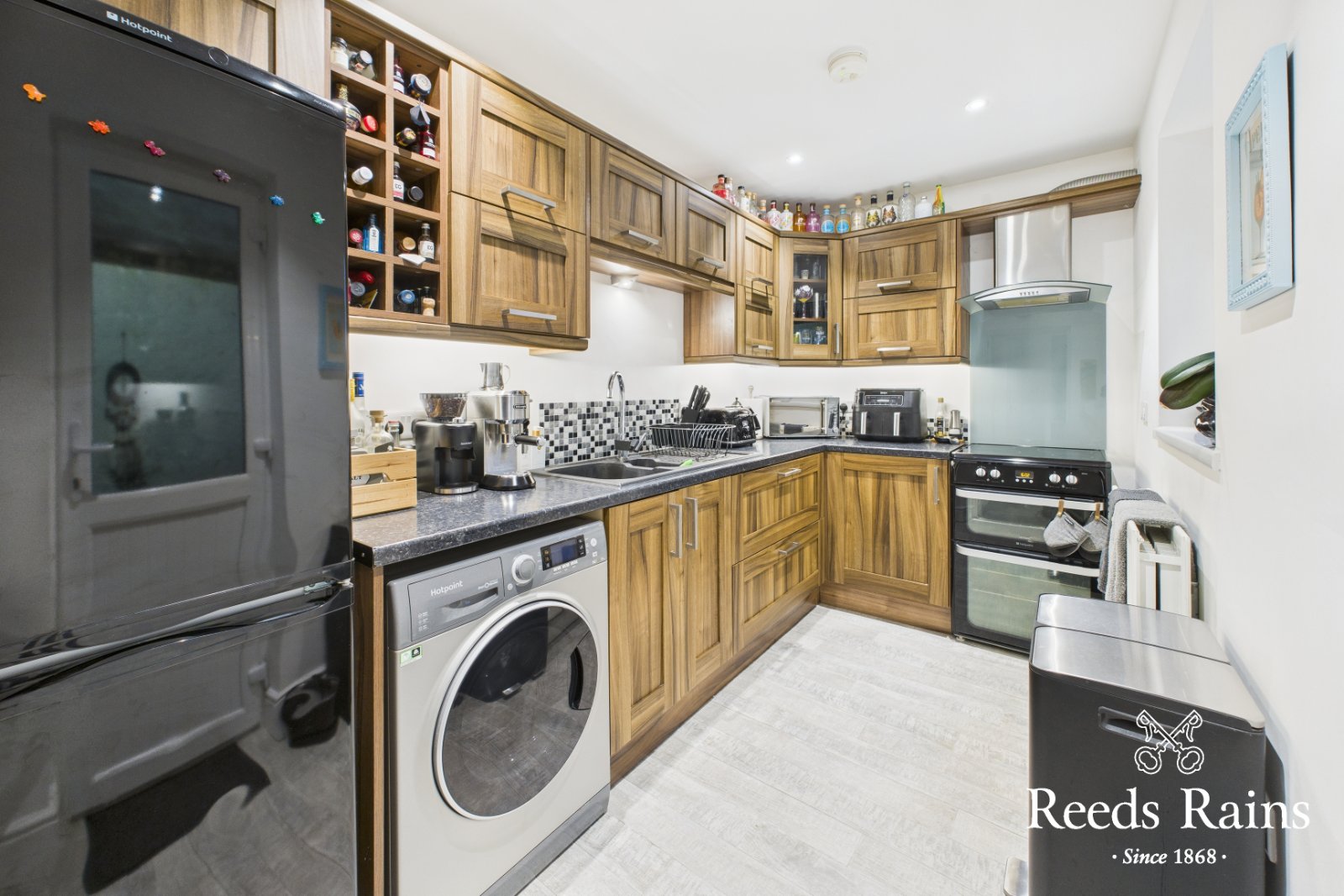 Modern fitted kitchen with a range of high and low units and laminate worktops. One and a half bowl single drainer sink unit with mixer tap Space for cooker and stainless steel extractor fan. Plumbing for washing machine and PVC door to rear.