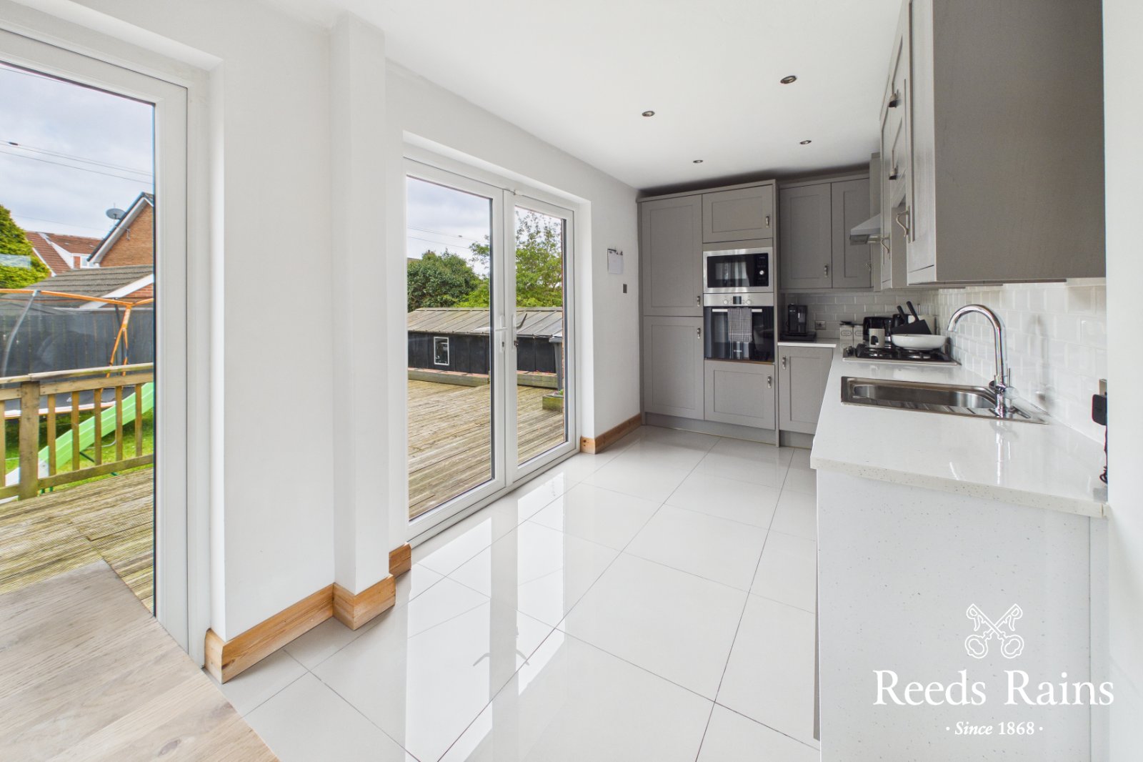 Designed with modern living in mind, the heart of the home is the impressive open plan kitchen, living, and dining area. This bright and spacious space is perfect for both everyday living and entertaining, featuring contemporary finishes and glazed doors that open seamlessly onto a generous decked area, ideal for outdoor dining.