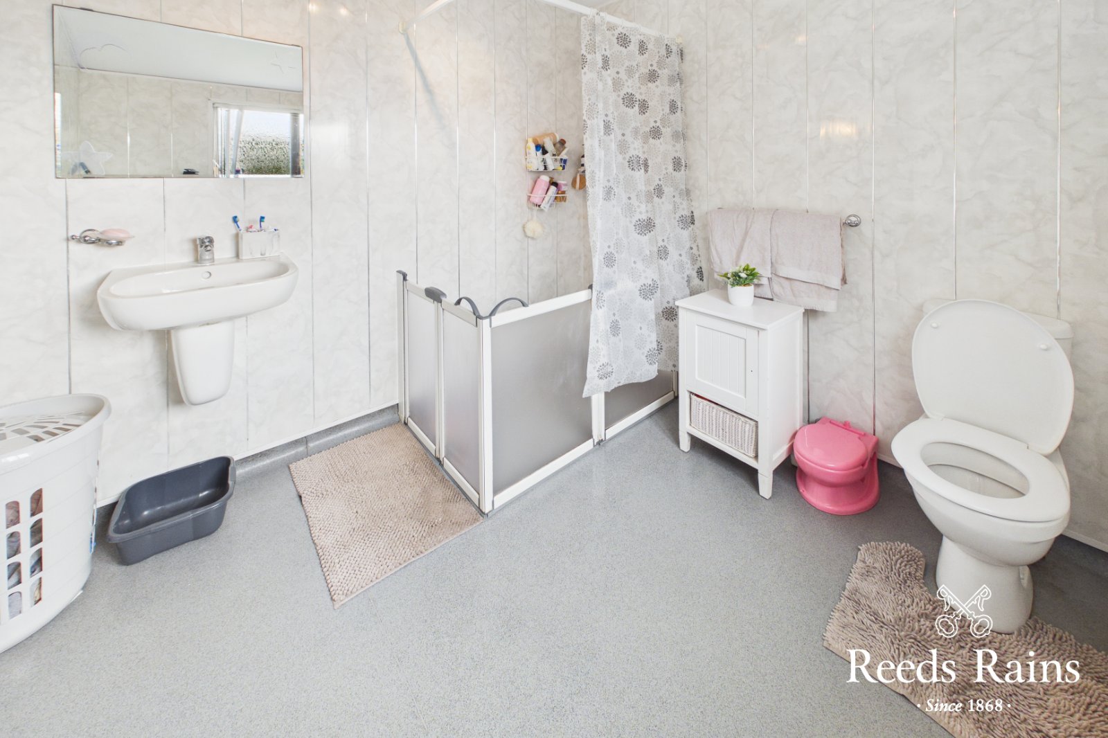 Three piece suite comprising low flush WC, wall mounted wash hand basin with mixer tap and shower cubicle with electric shower. Laminate wall panelling.