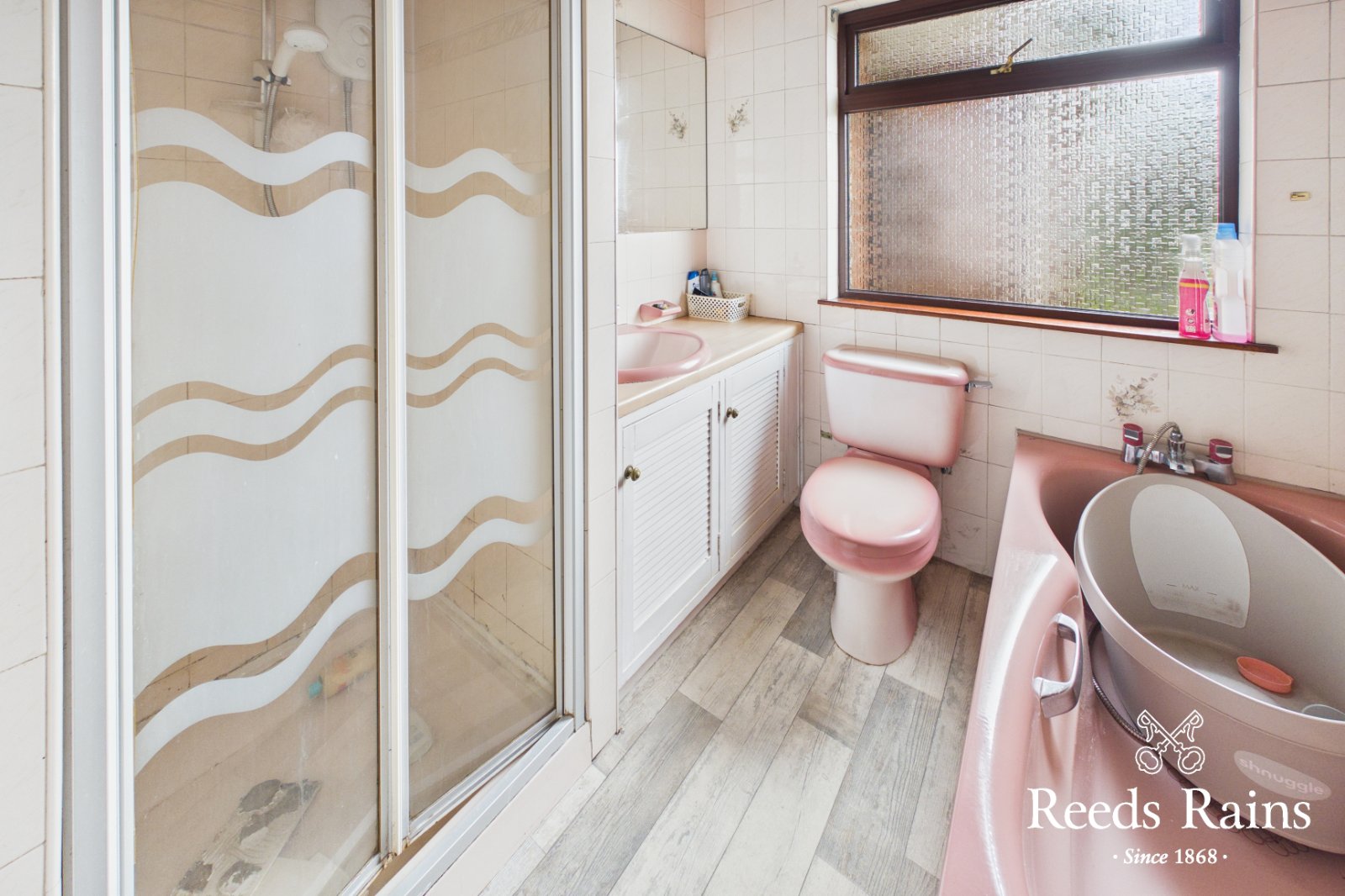 Coloured four piece suite consisting of low flush WC, pedestal wash hand basin with mixer tap, panelled bath with mixer tap and telephone hand shower and shower cubicle with electric shower. Tiled walls.