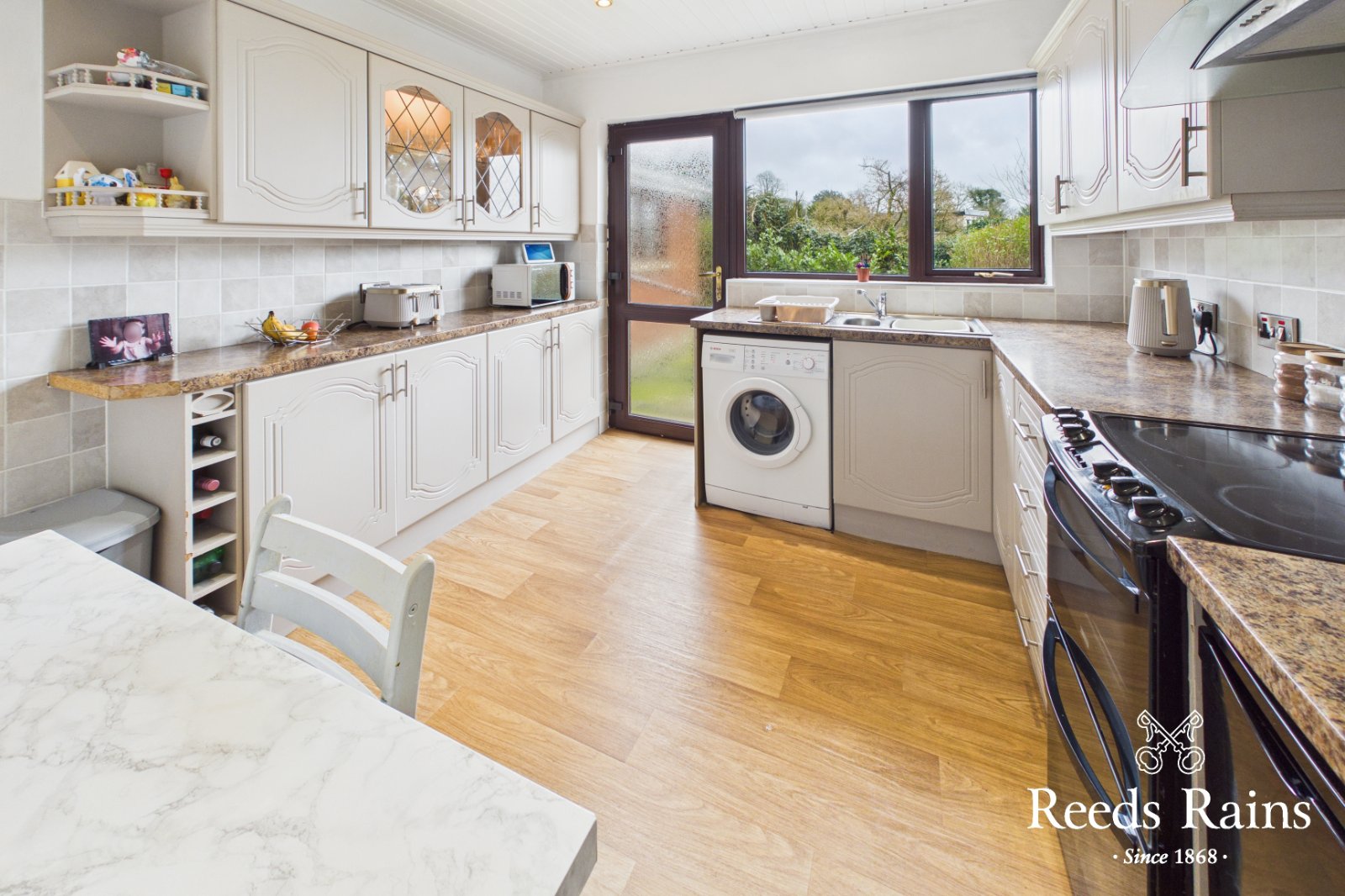 Fitted kitchen with a range of high and low units and laminate worktops. One and a half bowl stainless steel single drainer sink unit with mixer tap ,space for cooker, stainless steel extractor fan, space for fridge and plumbing for washing machine. Partially tiled walls, tiled floor and PVC glazed door to rear.