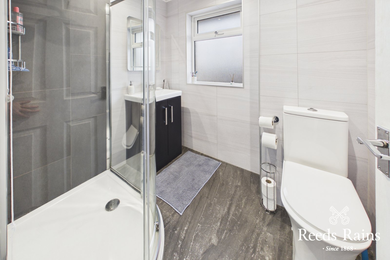 Recently fitted modern three piece white suite comprising a low flush WC, vanity wash hand basin with mixer tap and enclosed shower cubicle with thermostatically controlled shower and a drench shower head. Laminate floor, laminate wall panelling, towel rail and recessed spotlights.