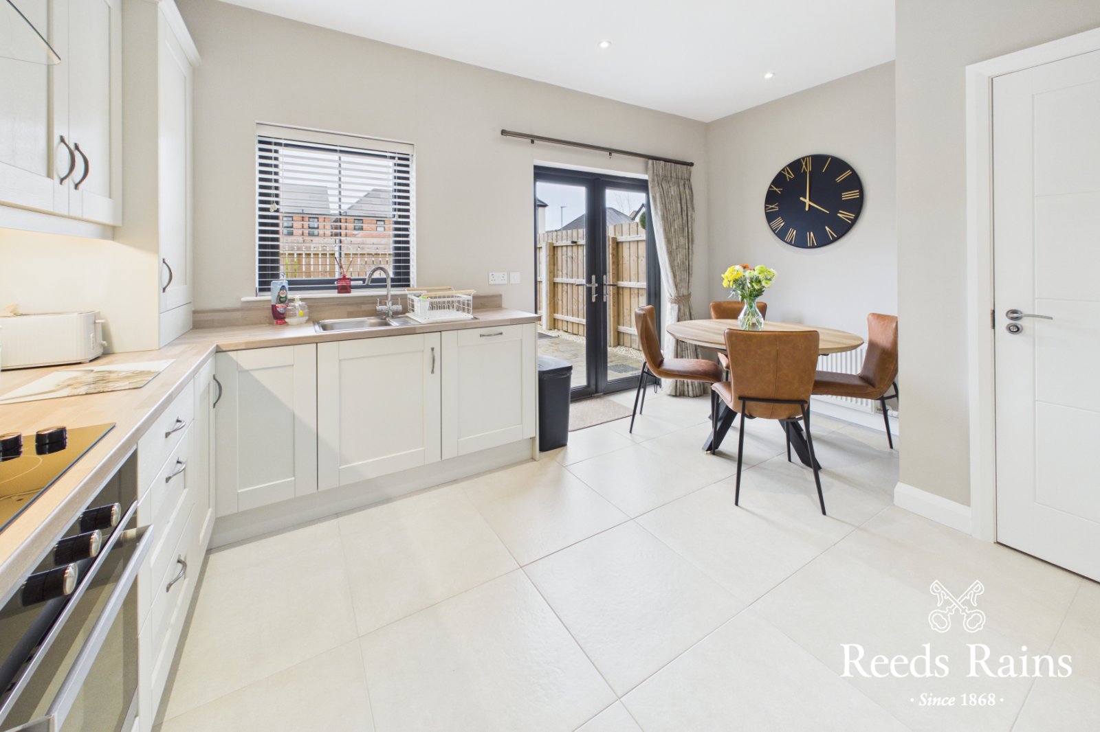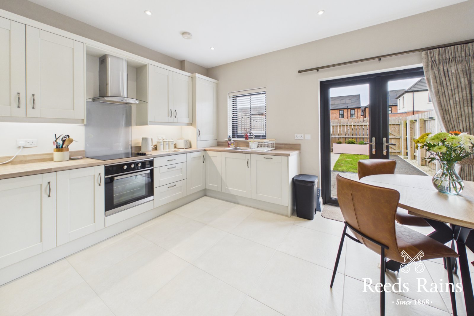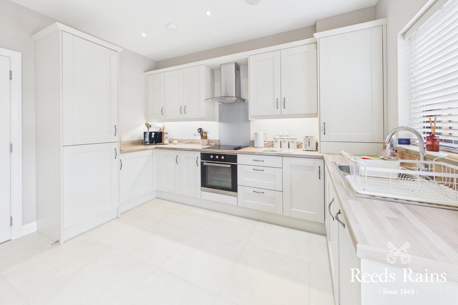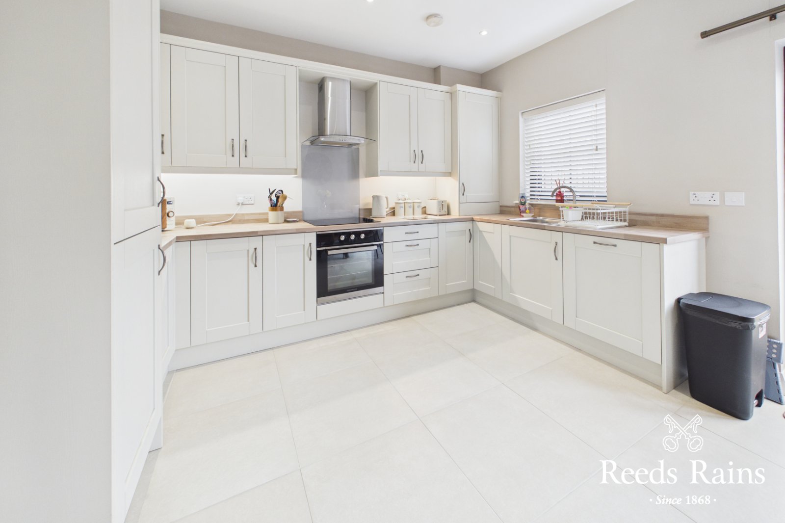 Luxury shaker style fitted kitchen with an excellent range of high and low level units and laminate worktops. Stainless steel single drainer sink unit with mixer tap. Single oven, 4 ring ceramic hob and stainless steel extractor fan. Integrated fridge freezer, dishwasher and washer/dryer. Gas boiler housing. Tiled floor and recessed spotlights. French doors to rear.