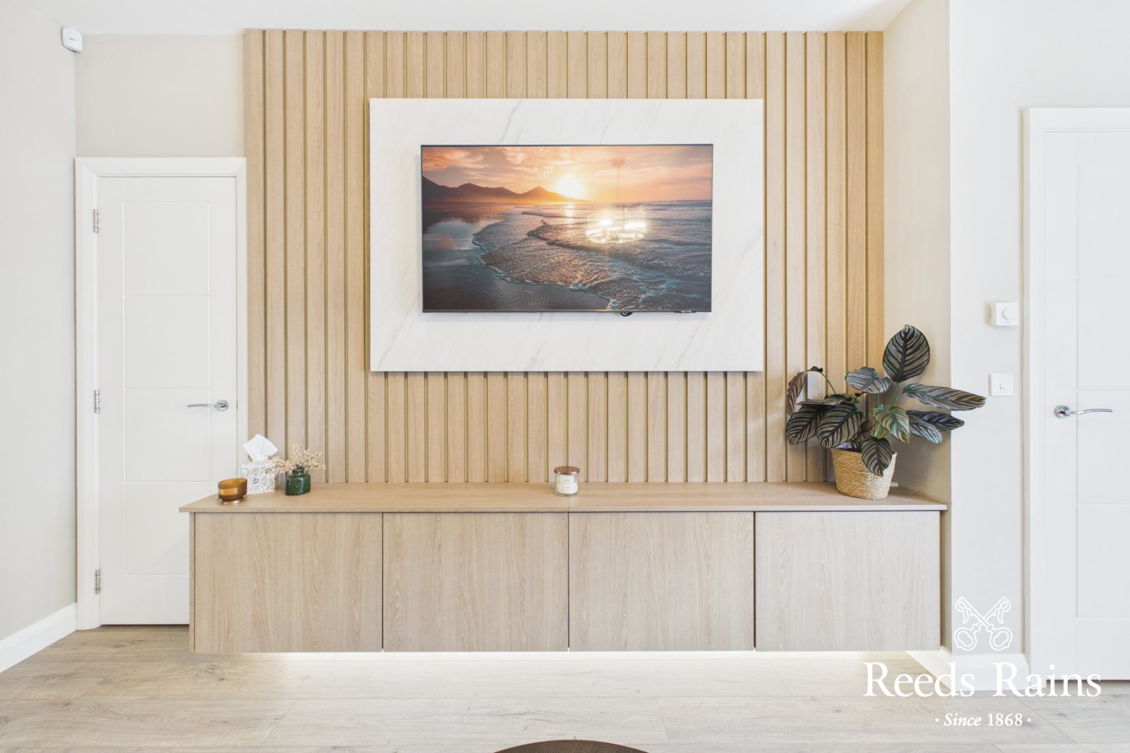 Laminate floor. Media wall with floating unit and feature wall panelling.
