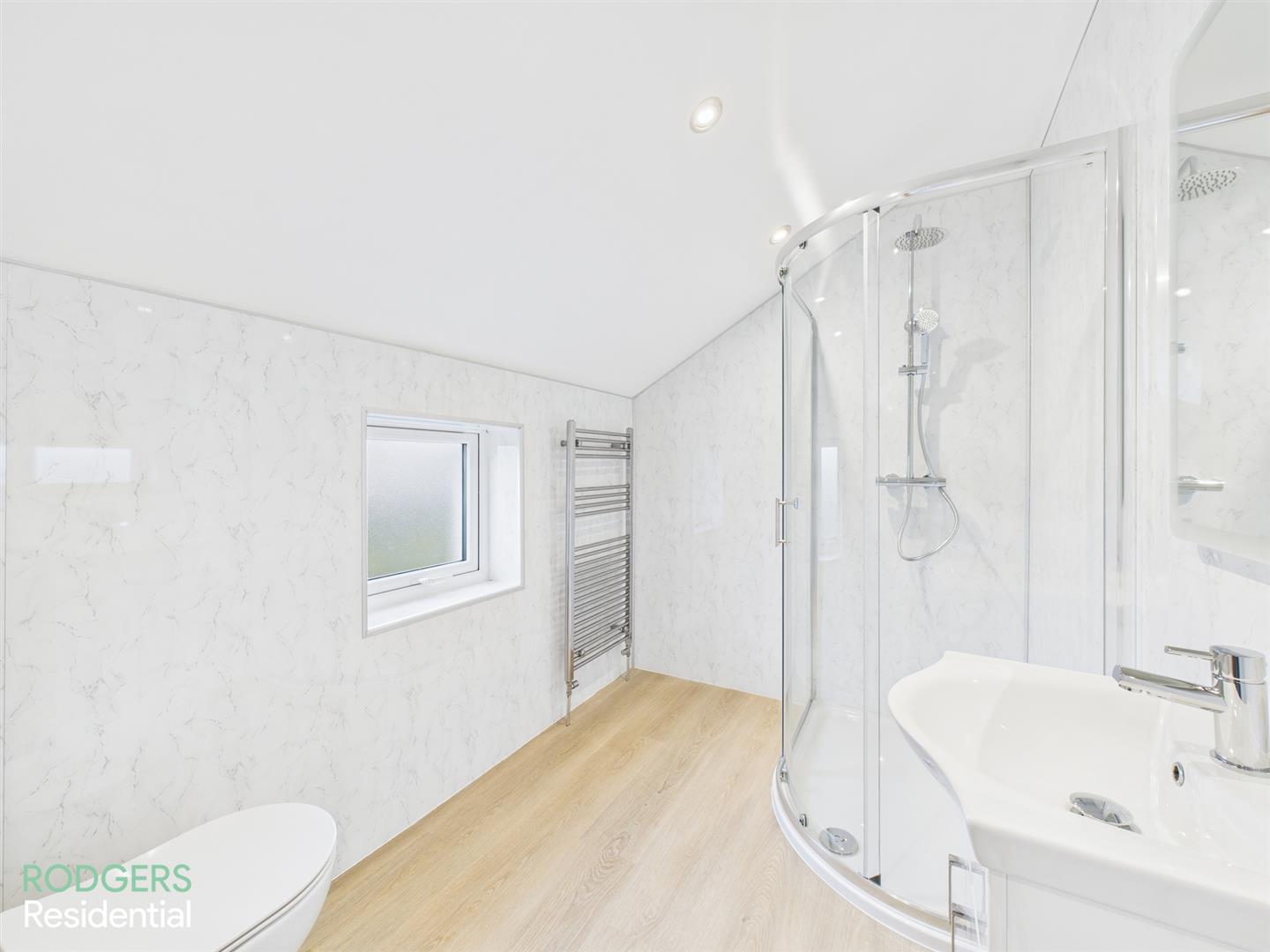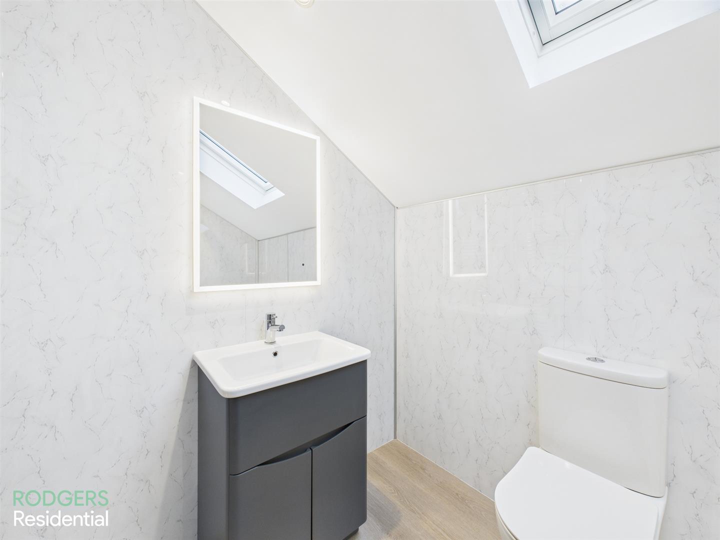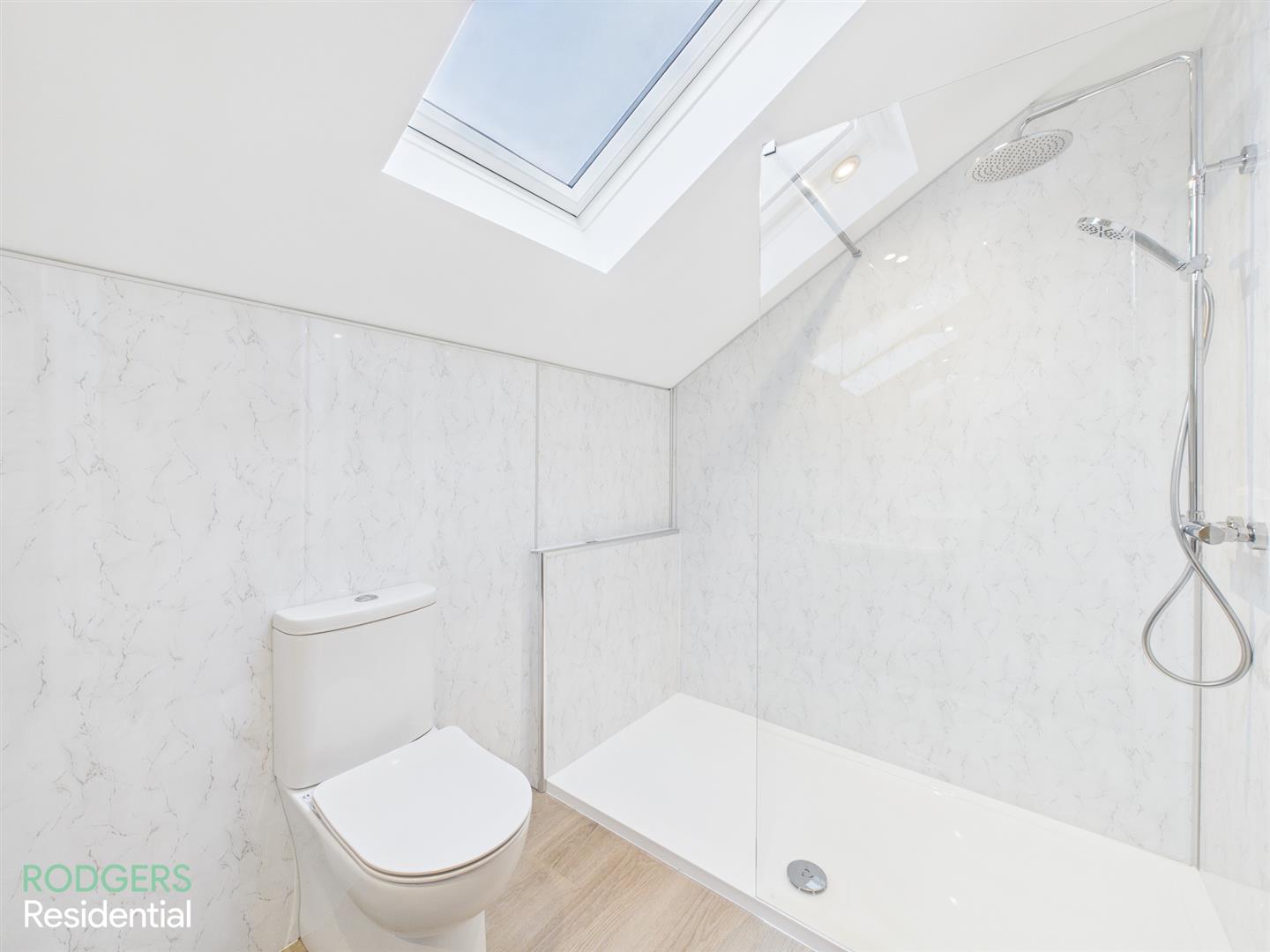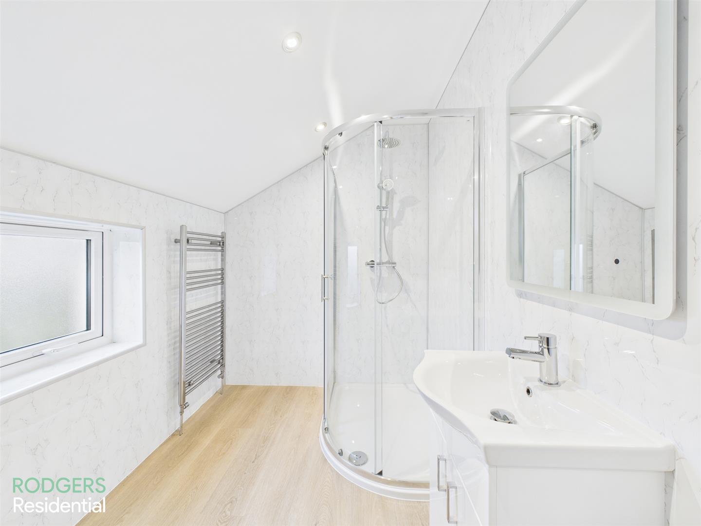 Wood Laminated Flooring, Walk-In Shower Enclosed With Thermostatically Controlled Shower Unit (Rain Fall & Telephone Heads), Chrome Heated Ladder Towel Rail, Sink With Vanity Unit & Chrome Mixer Tap, Rectangular LED Bathroom Mirror, Low Flush WC, Extractor Fan, Roof Window, Low Voltage Recessed Lighting