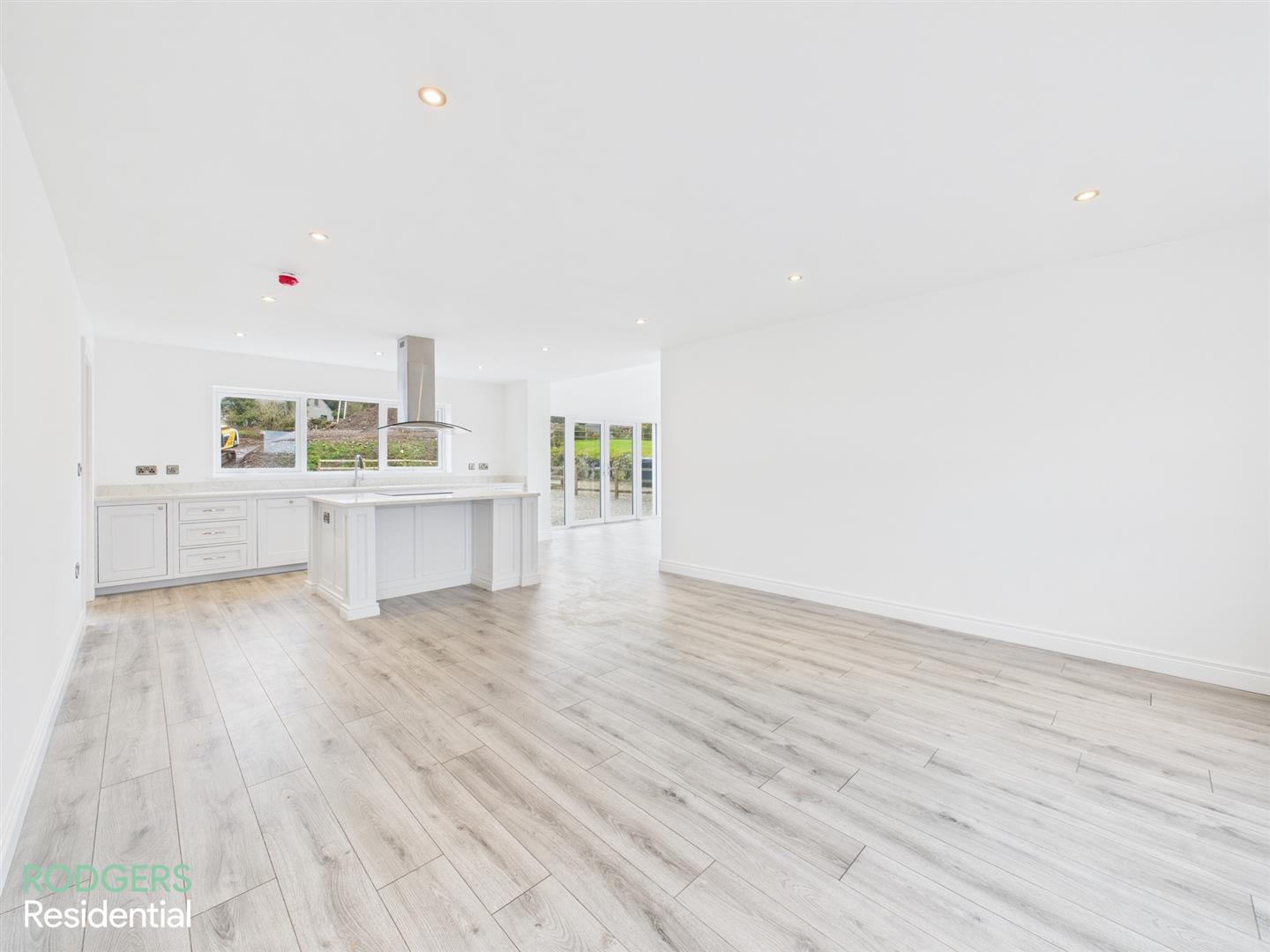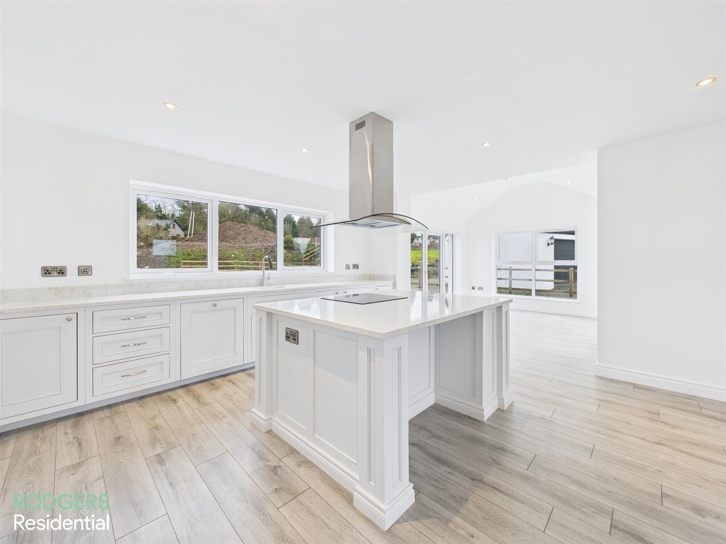 Open Plan Kitchen/Living Area, Wood Laminated Flooring, Under Floor Heating, Bespoke Handmade Kitchen To Include: Centre Island With Electric Hob & Electric Oven, Overhead Stainless Steel Extractor Fan, Custom Wine Storage Rack, Shaker Style Kitchen Units With Quartz Work Surfaces With Up Stands, Undermounted Sink With Chrome Mixer Tap, Integrated Dish Washer, Low Voltage Recessed Lighting, Leading To..