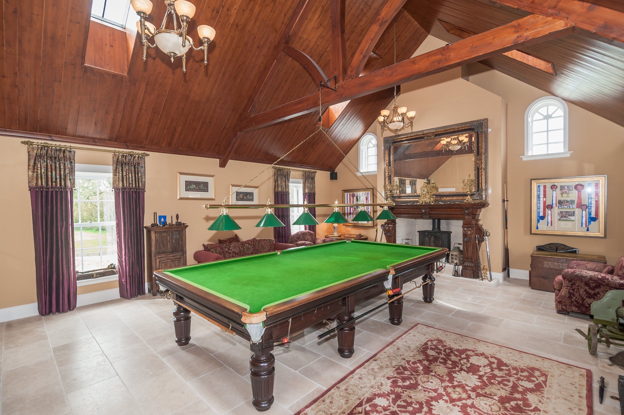 - Games room with vaulted timber ceiling with exposed roof trusses, Georgian carved wooden fireplace with Bath Stone hearth and recess with cast iron stove and Travertine limestone tiled floor