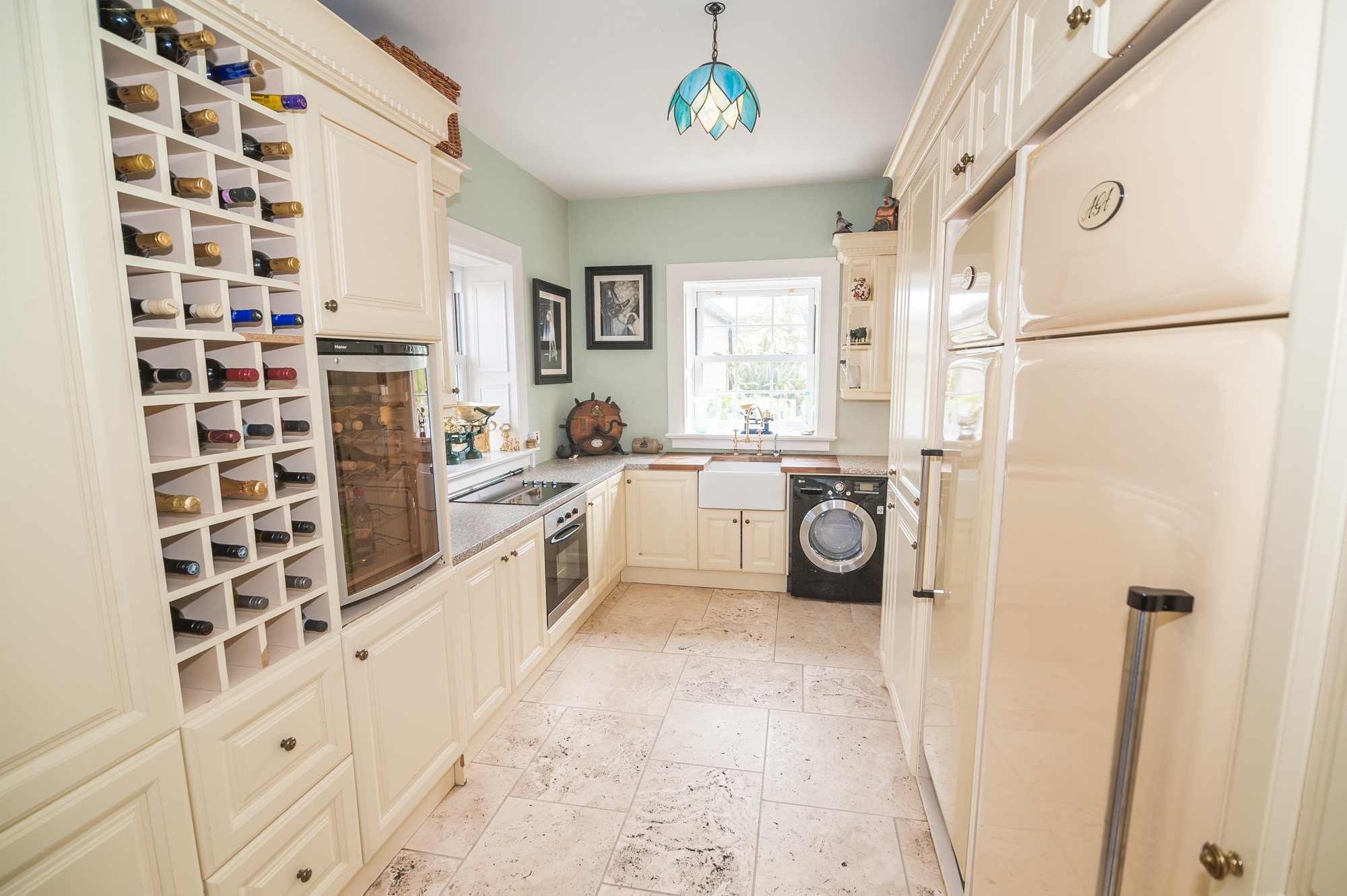 - Bespoke fitted kitchen in hand painted cream with central island unit, granite work surfaces, Aga, dresser and larder. Space for large kitchen table and chairsBack kitchen with range of units, integrated appliances and Belfast style sink