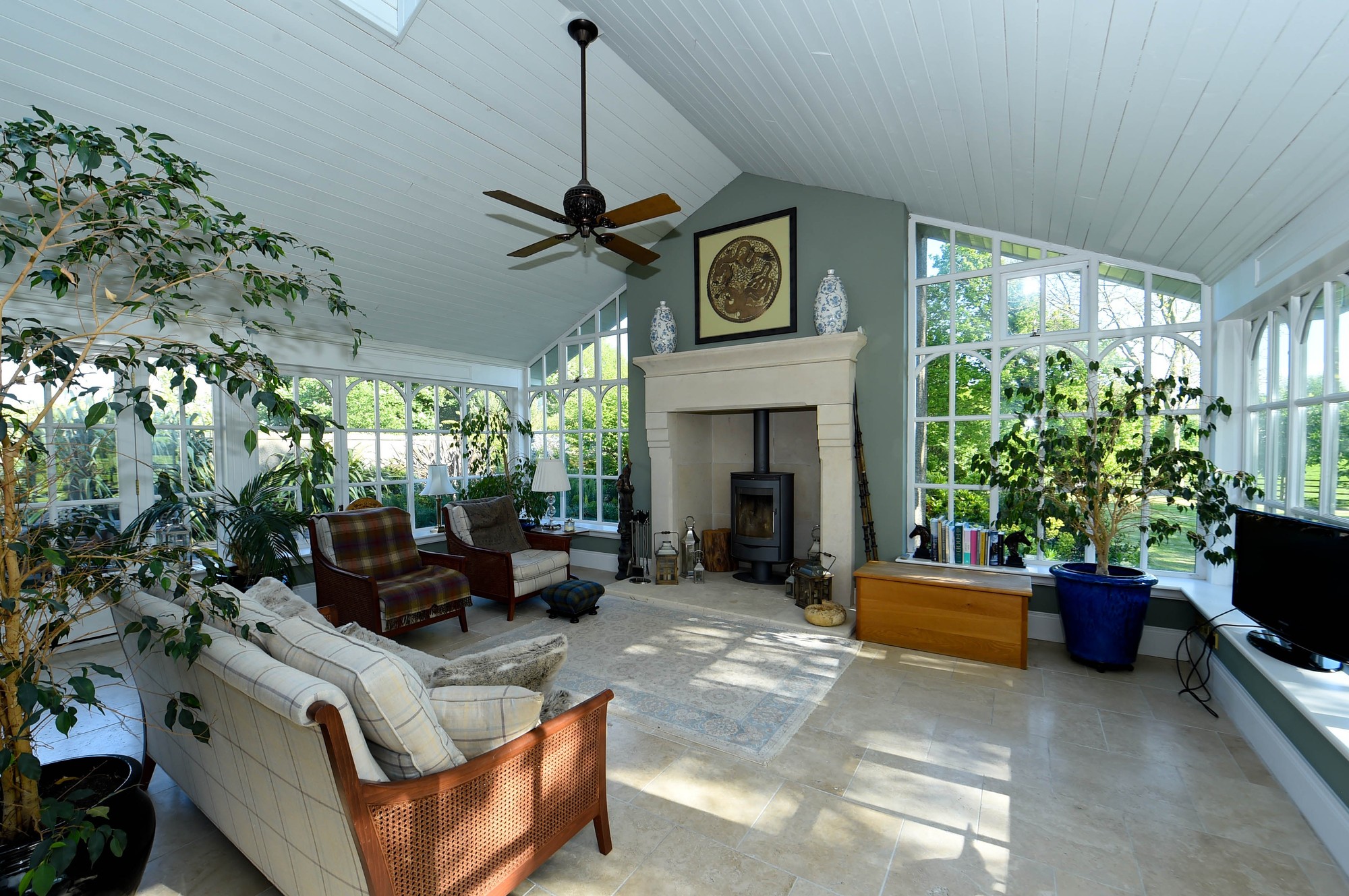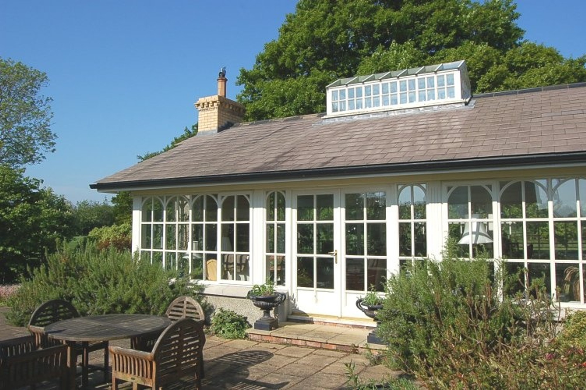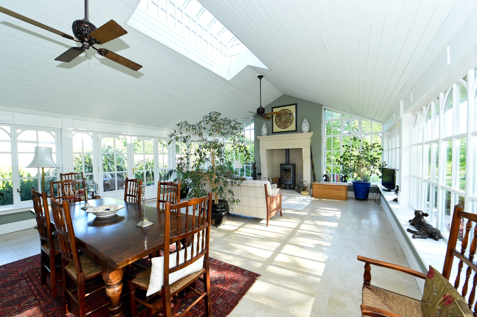 - Orangery with glazed central lantern, vaulted timber ceiling and open chimney breast with Bath Stone fireplace and contemporary log burning stove. This beautiful bright room overlooks the terrace and garden and is currently used as a sitting room at one end with large dining room table at the other