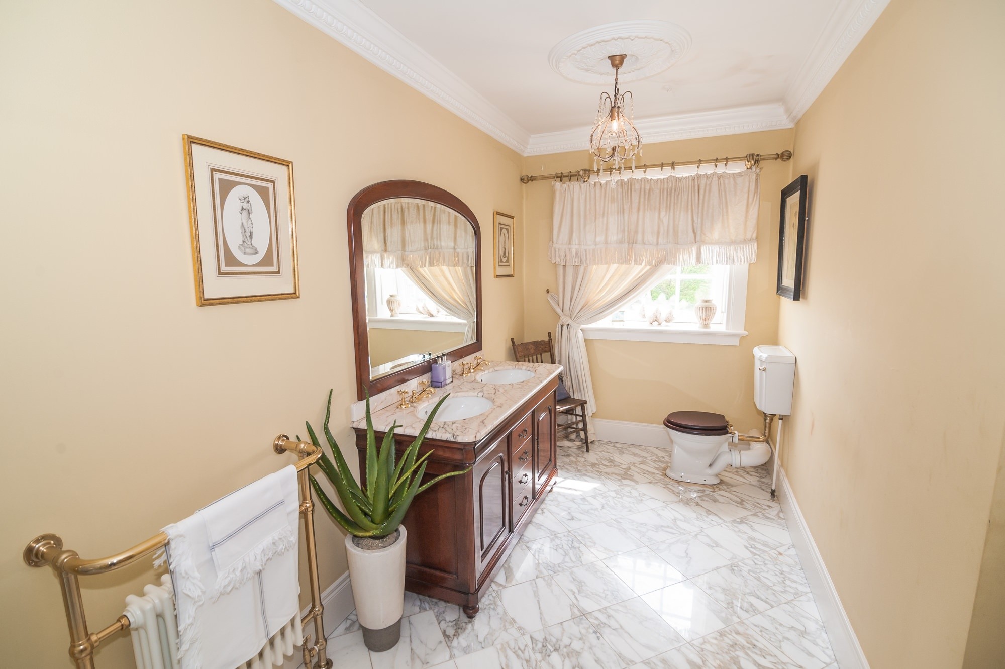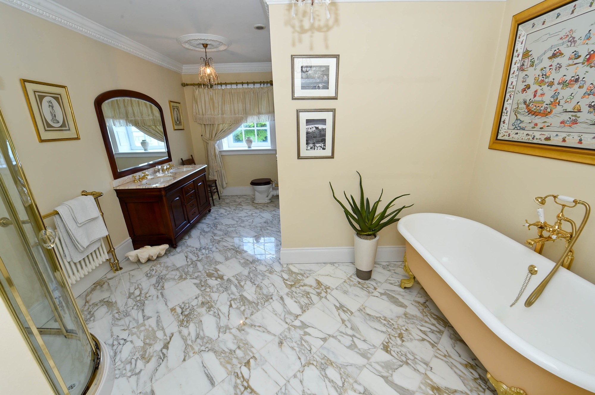 - Reception hall with mahogany central staircase leading to gallery landing, impressive chandelier and marble flooring. Cloakroom with W.C.