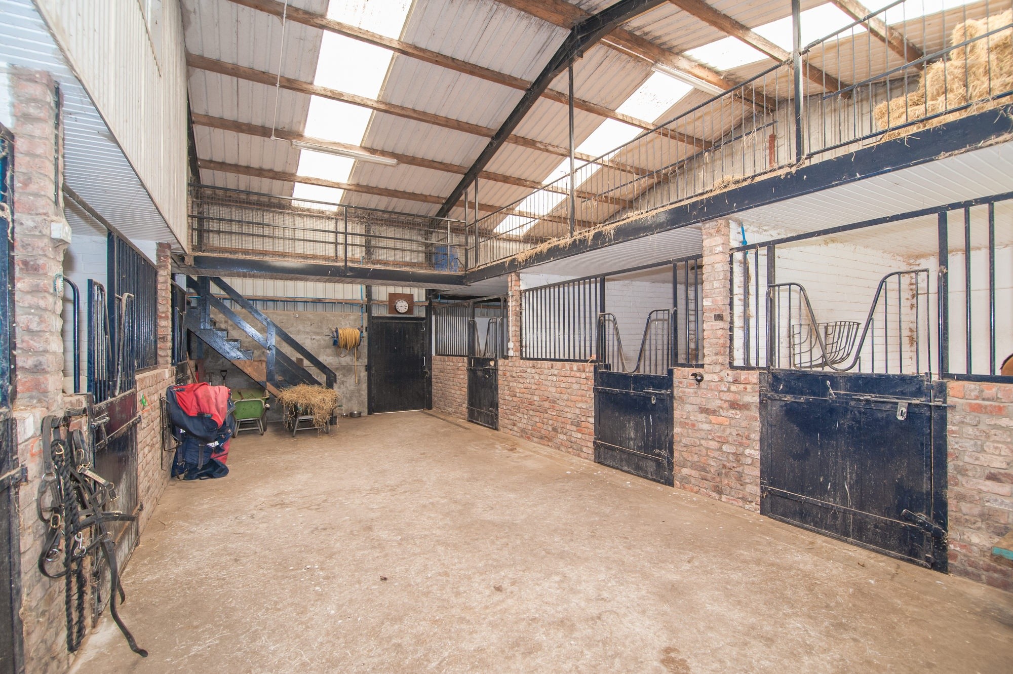 - Six indoor stables with loft over, tack room and fodder storage areas and direct access to sand manege 40m x 30m and paddocks