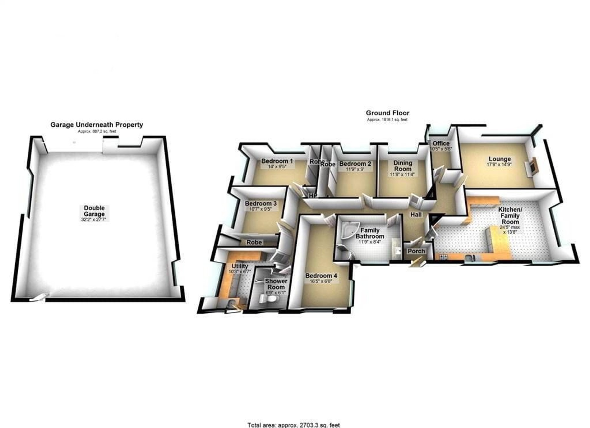 The house is spacious with living room, kitchen with extra living and dining space, dining room, playroom, four bedrooms and two bath/shower rooms. There is also a utility room and a huge double garage in the basement that extends to 900 sq ft (83 sq m). The gardens are set out in lawn with gravel driveway and parking area. The house would be suitable for a dependent relative to share with their own separate access if required.