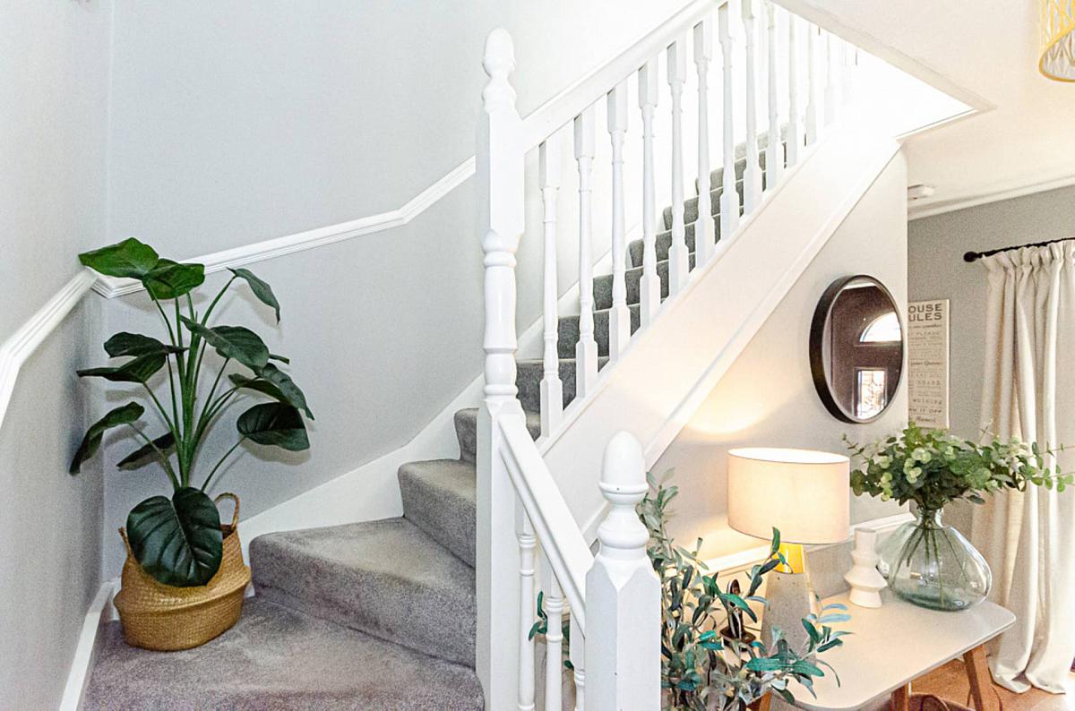 Storage under stairs and timber laminate floor.