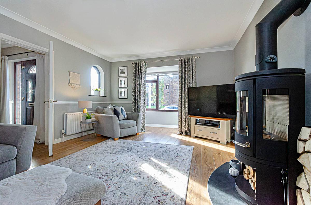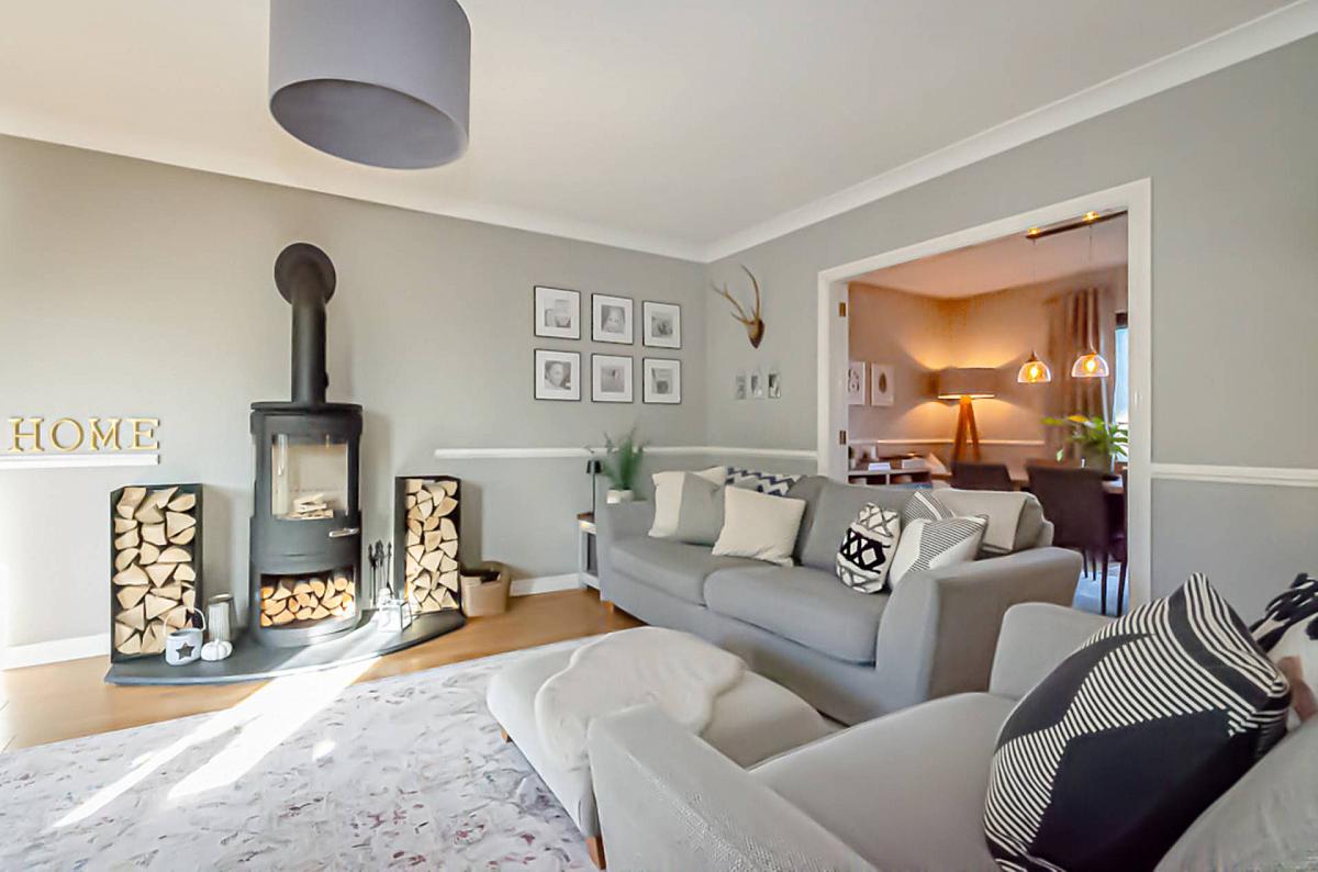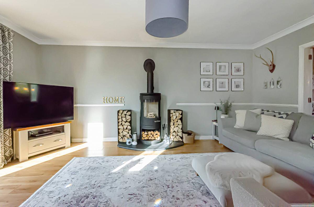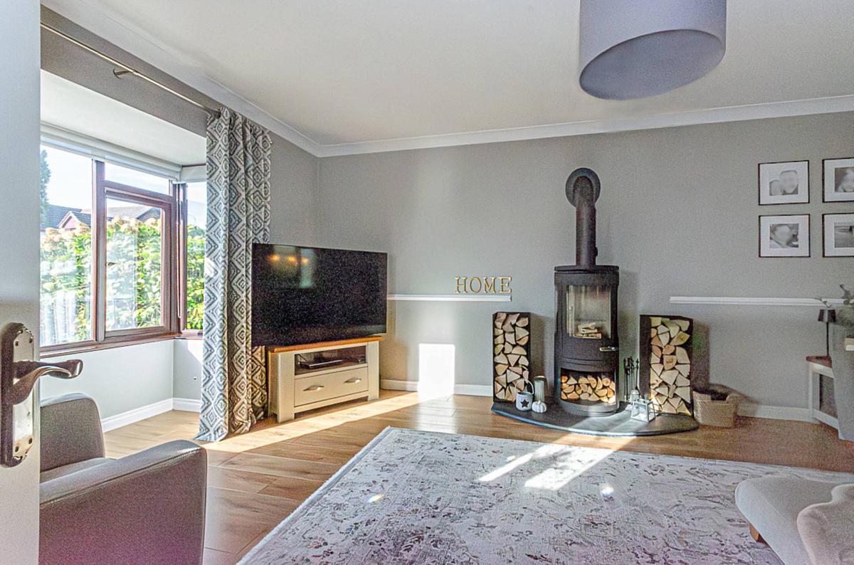 Bay window, cornice, dado rail, timber laminate floor, log burner on slate hearth and double doors to dining room