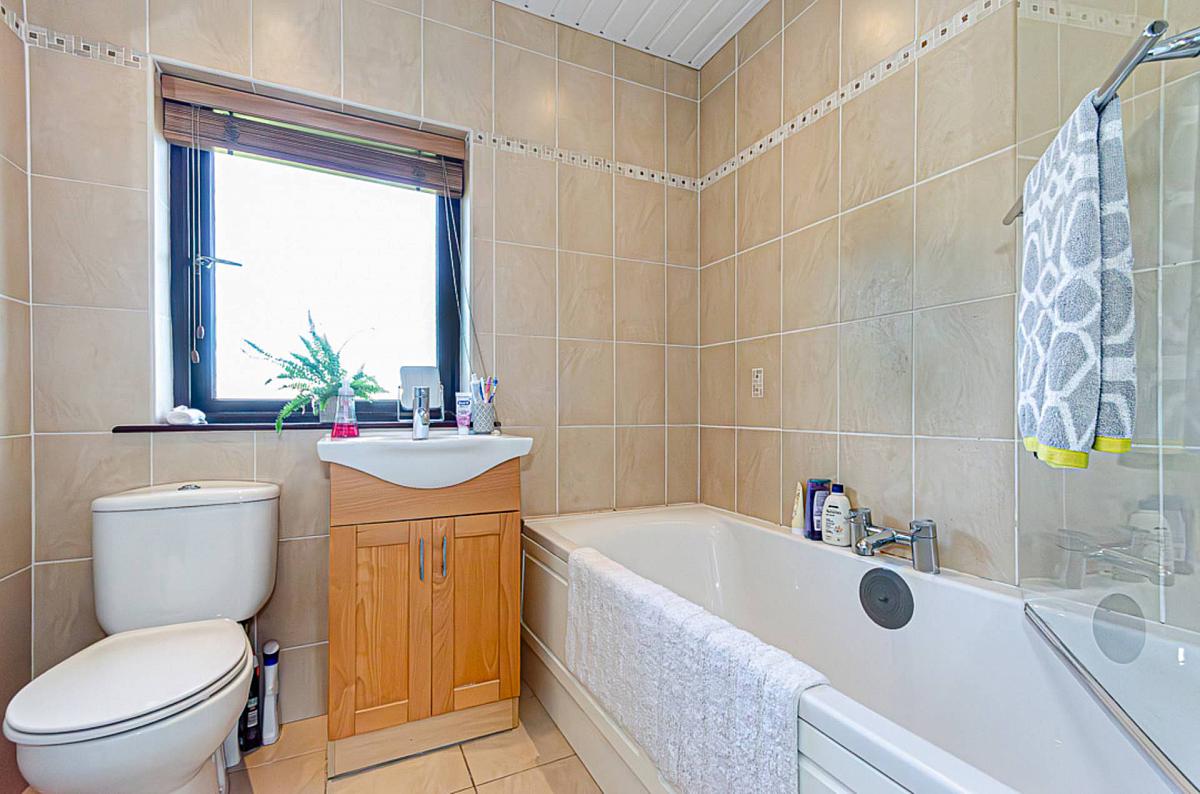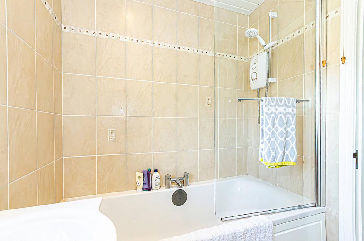 White suite, bath with side mounted taps, electric shower and screen, wash hand basin in vanity unit, W.C, tiled walls, ceramic tiled floor, PVC panelled ceiling, recessed spotlights and extractor fan