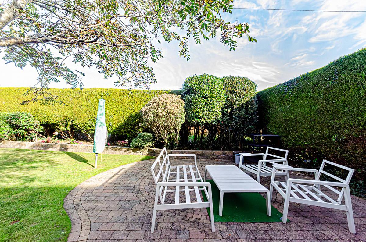 Rear garden in lawn and paving, raised brick patio, shrubs and trees with oil storage tank. Outside light and tap