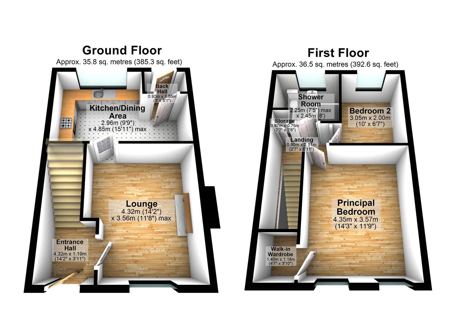 This well-presented home offers a bright and comfortable living environment with modern finishes throughout. The ground floor includes a spacious lounge and a practical kitchen/dining area with direct views of the rear garden. Upstairs, you'll find two bright and welcoming bedrooms, each offering a comfortable retreat at the end of the day. The main bedroom features handy built-in storage, while the second bedroom enjoys a peaceful outlook over the rear garden-ideal for guests, a home office, or a cosy nursery. A contemporary shower room with fully tiled walls, Mira electric shower, pedestal wash hand basin, low flush WC, and extractor fan completes the first floor.