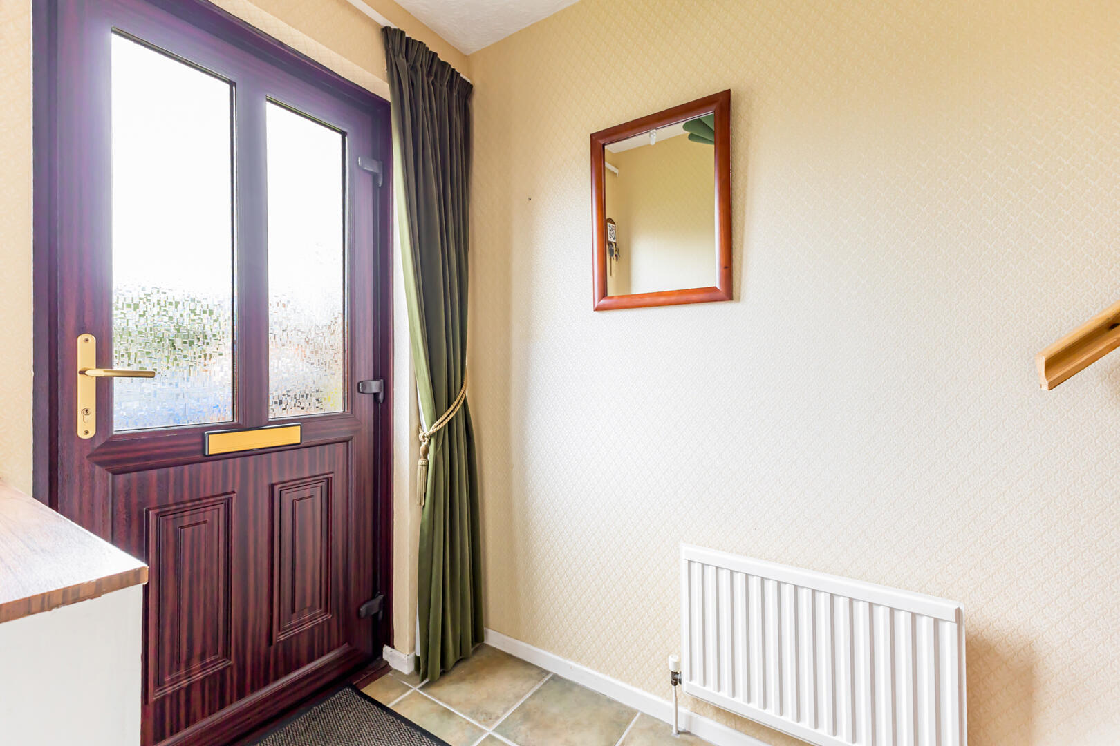 Practical rear hallway with porcelain tiled floor and fully tiled walls. Access to rear garden via uPVC back door with frosted glass insets.