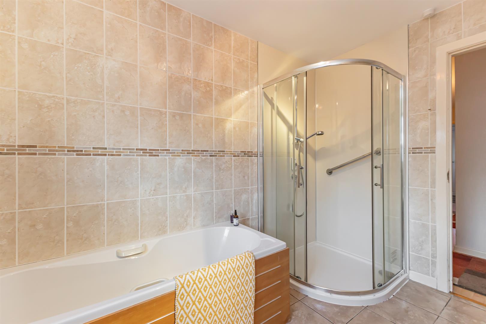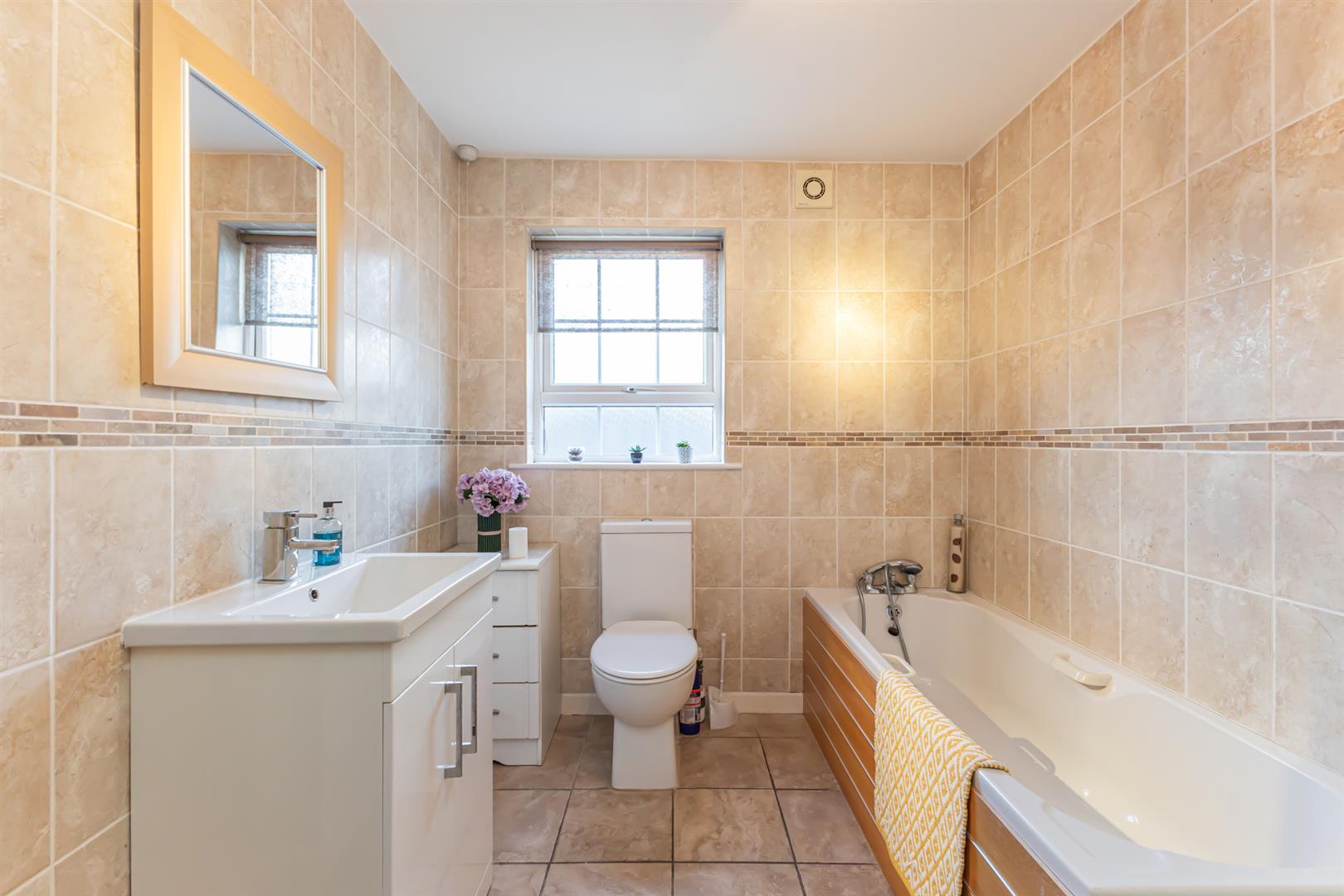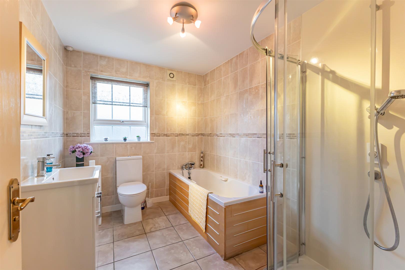 Tiled floor, tiled walls, outlook to rear, shower cubicle with Aqualisa shower and panelled walls, bath with chrome tap and handheld attachment, low flush WC, vanity unit with sink and chrome mixer tap, extractor fan