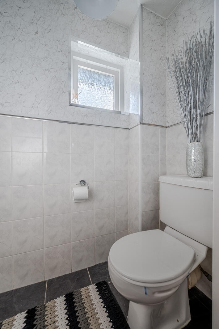 Comprising low flush WC, fully tiled floor, part tiled walls.