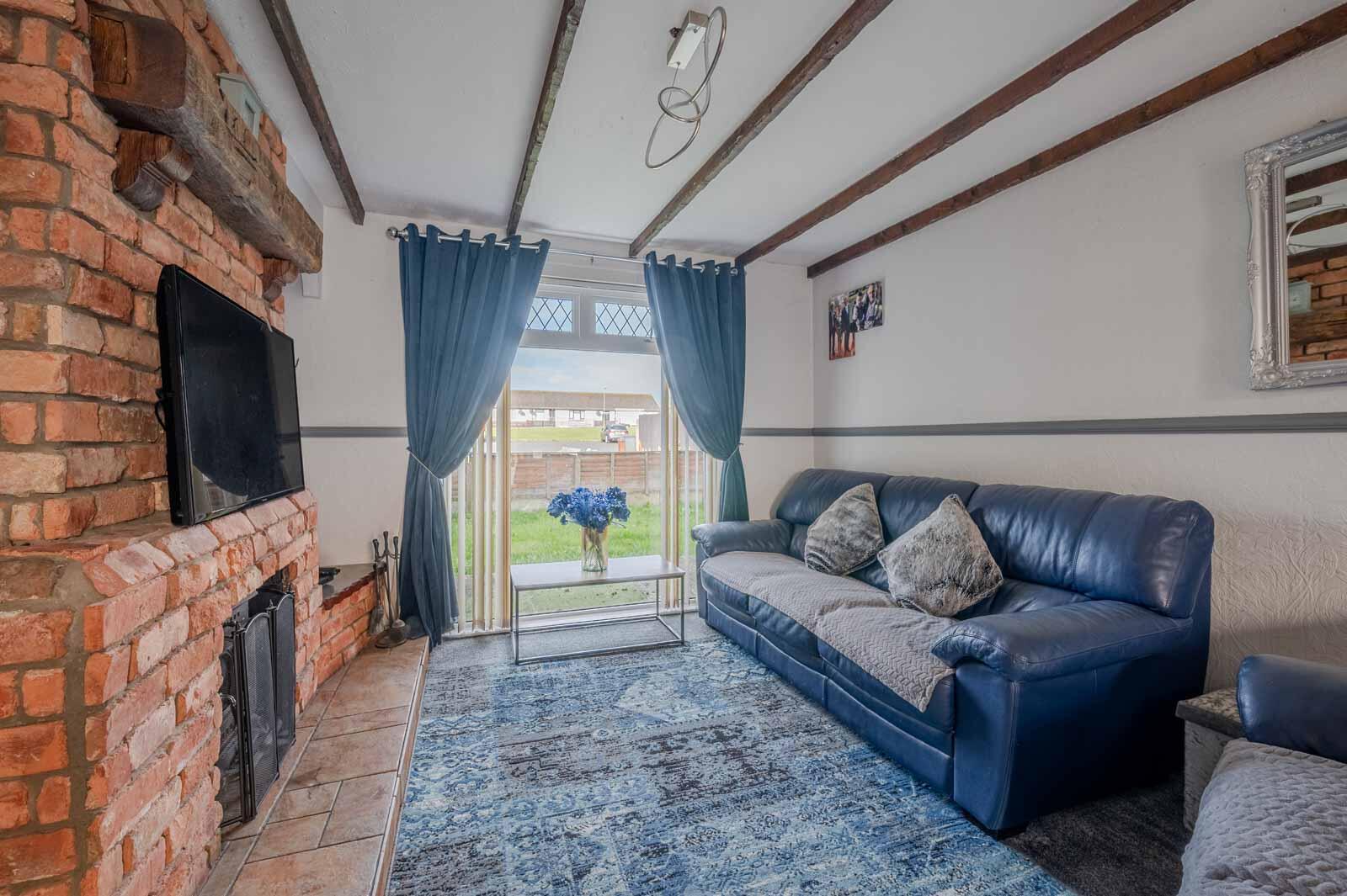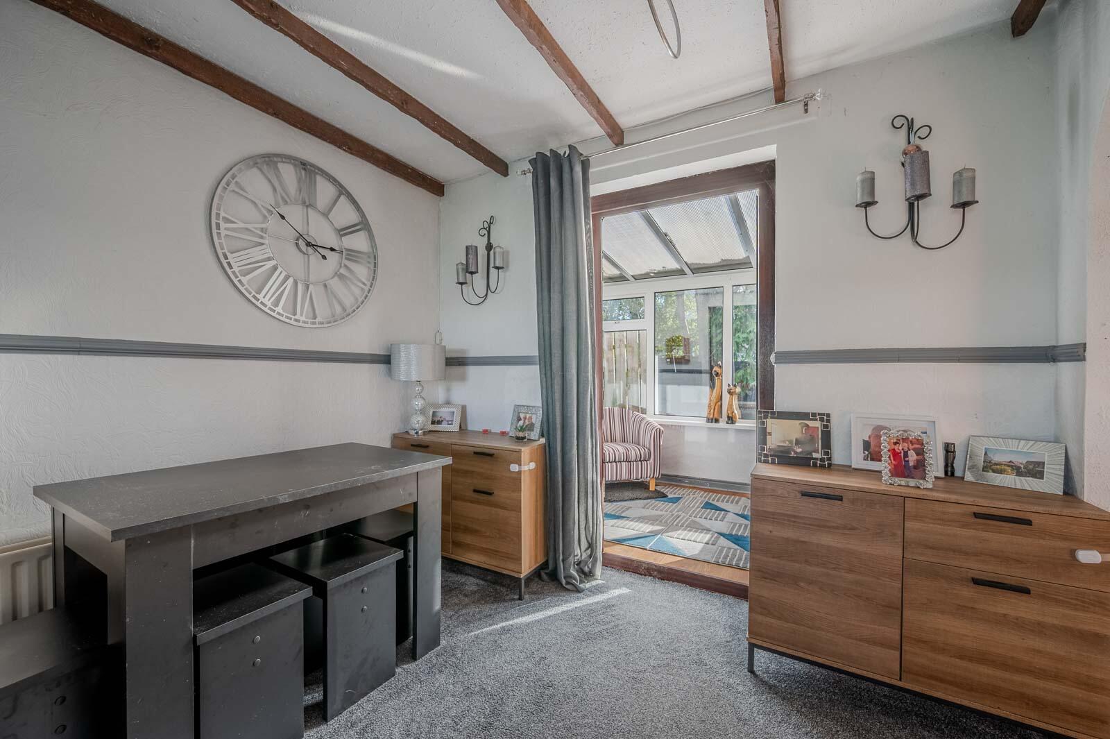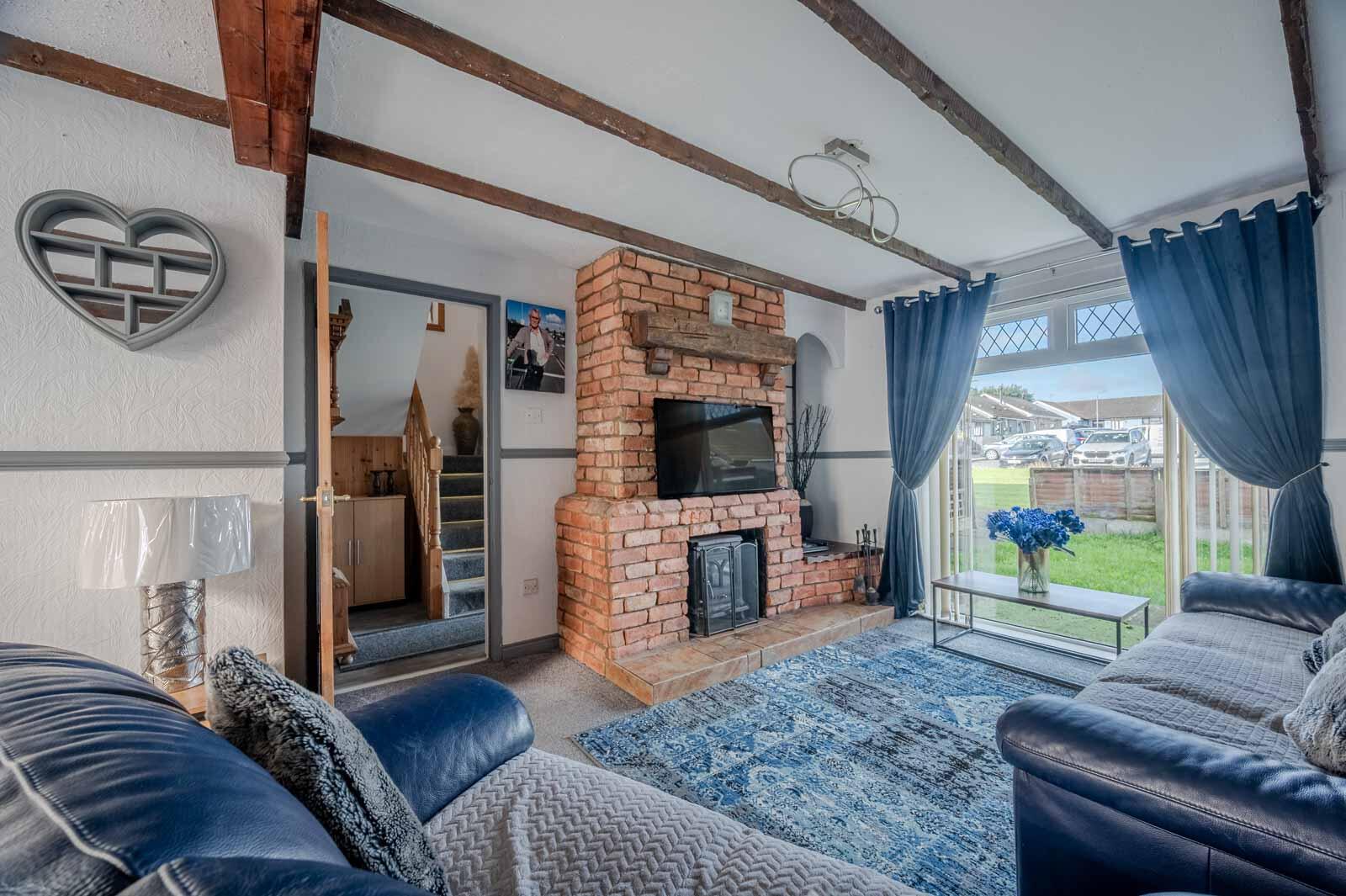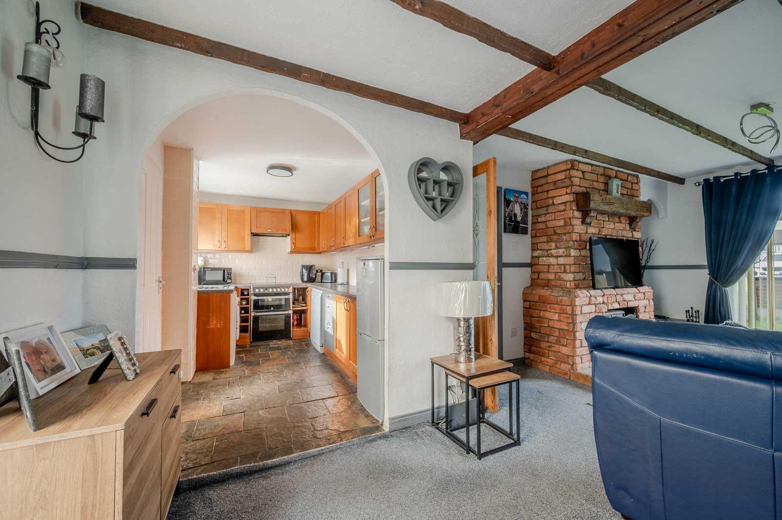 at widest points. Attractive brick fireplace, tiled hearth, cast iron wood burning stove, archway to kitchen, uPVC double glazed door to conservatory, dado rail.
