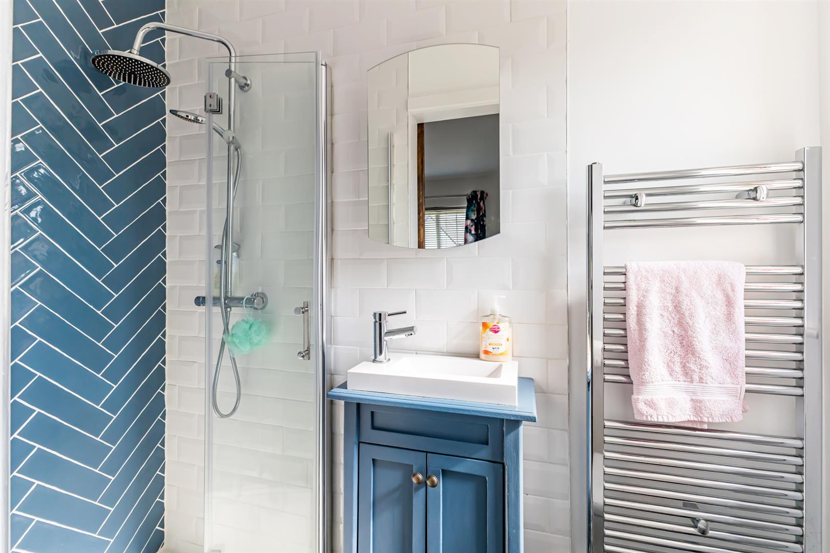 Decorative tiled floor, part tiled walls, chrome heated towel rail, extractor fan, outlook to side, three-piece modern white suite comprising; low flush WC, vanity unit with sink and chrome mixer tap, shower enclosure with glass door, thermostatically controlled handheld shower and overhead drencher.