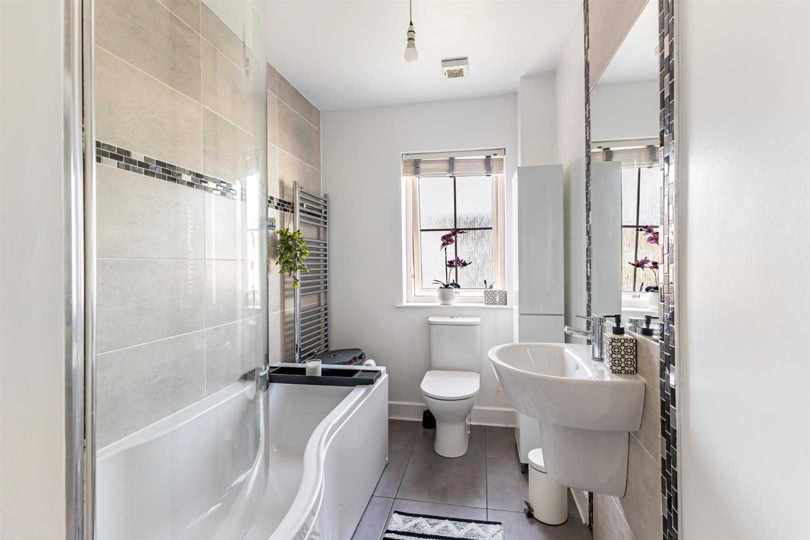 Porcelain tiled floor, part tiled walls, outlook to front, chrome heated towel rail, extractor fan, three-piece modern white suite comprising; low flush WC, pea shaped bath with glass shower screen, chrome mixer tap and thermostatically controlled shower, ½ pedestal sink with chrome mixer tap.