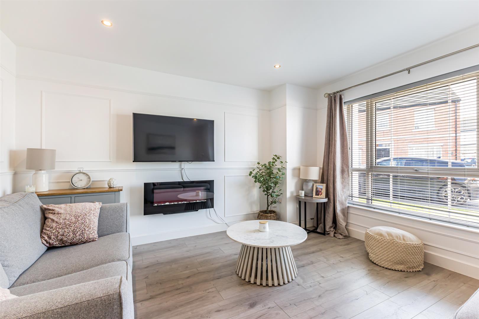 Laminate wood flooring, outlook to front, decorative panelled walls, recessed spot lighting, feature electric fire