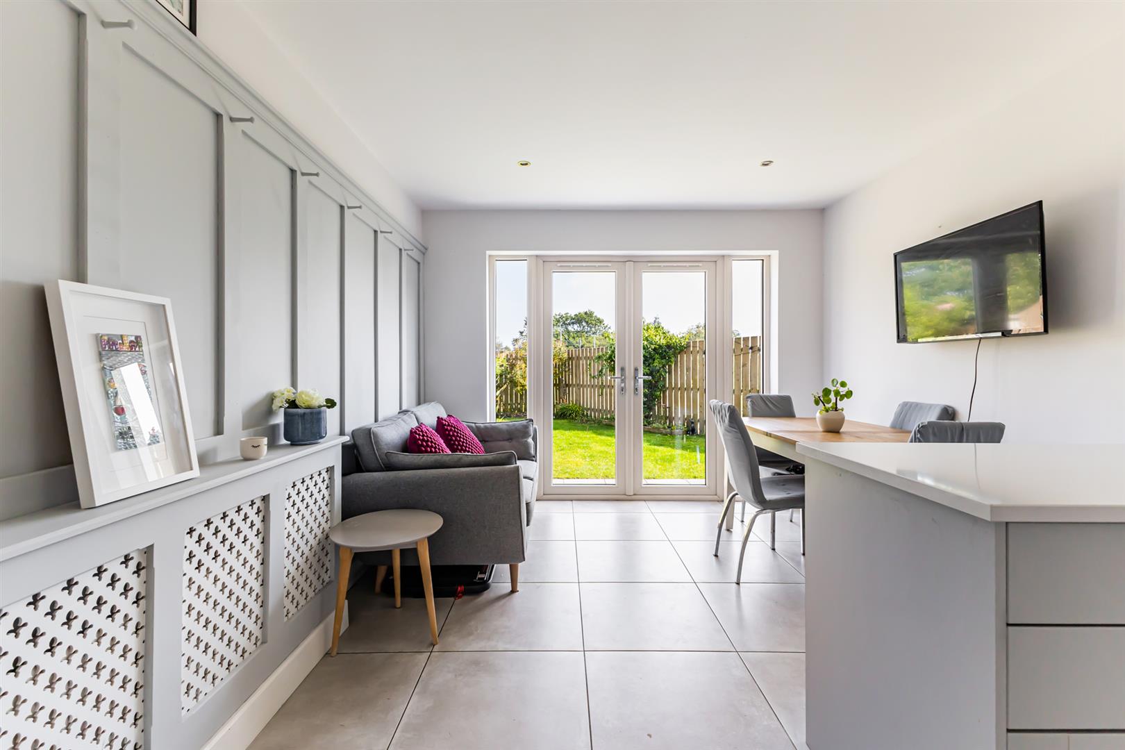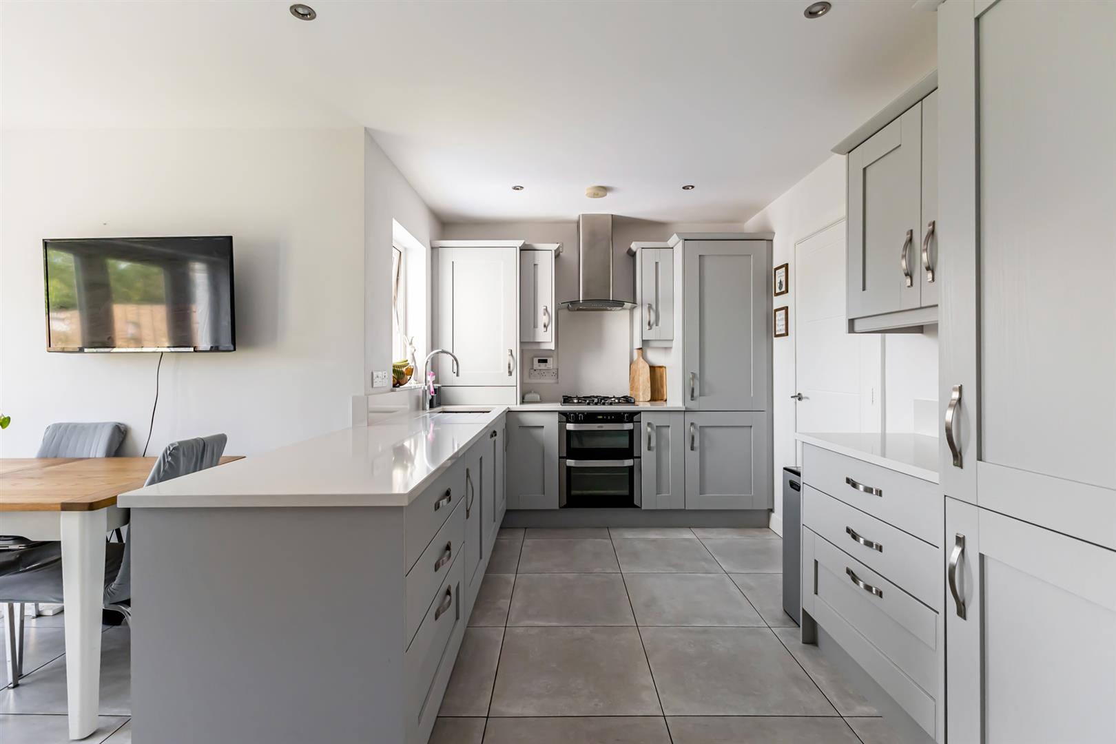 Porcelain tiled floor, part panelled walls, recessed spot lighting, range of low and high level units with solid wood doors, Quartz worksurface and uprights, integrated fridge / freezer, pantry style cupboards, integrated dishwasher, inset stainless steel Franke sink with chrome mixer tap, Belling electric ovens / grill, extractor fan, four ring gas hob, concealed Vaillant gas boiler, access to utility room, ample dining space, living space with outlook over the rear garden.