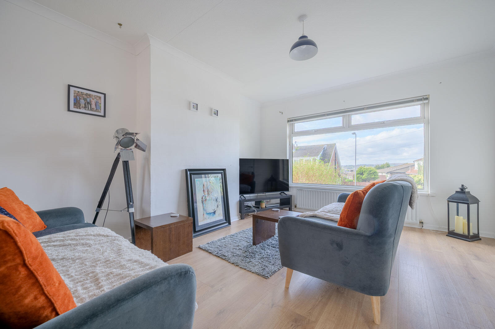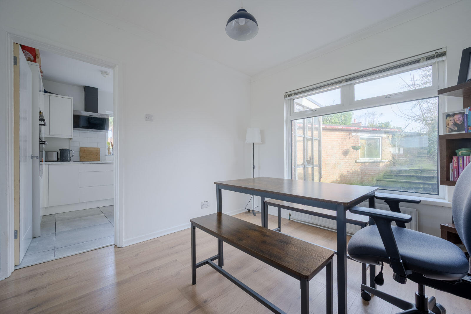 Cornice ceiling, laminate wood effect floor.