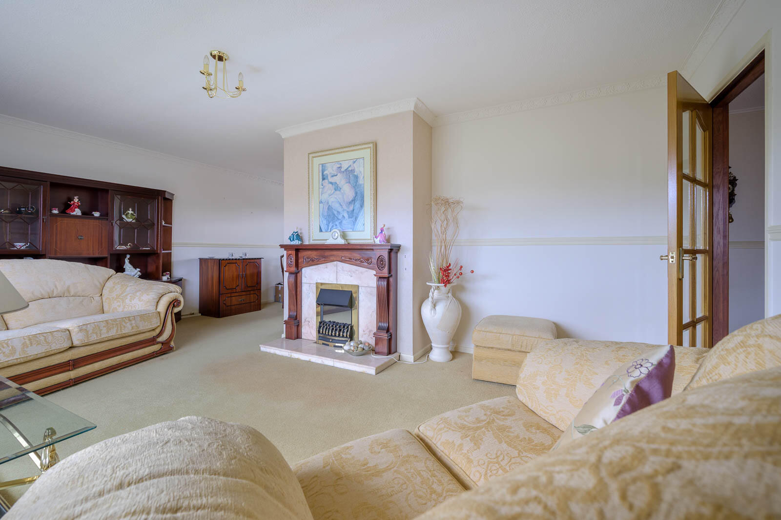 L-Shaped Living Room with Attractive Mahogany Fireplace and Open Fire