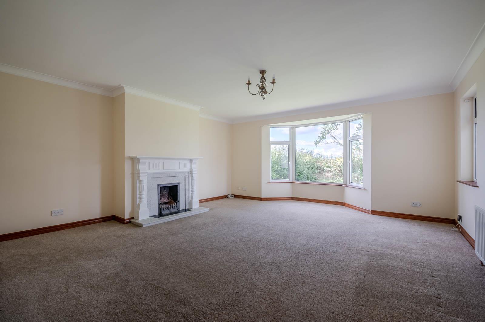 Large, spacious living room with attractive marble fireplace with an open fire and feature bay window with a rural outlook.